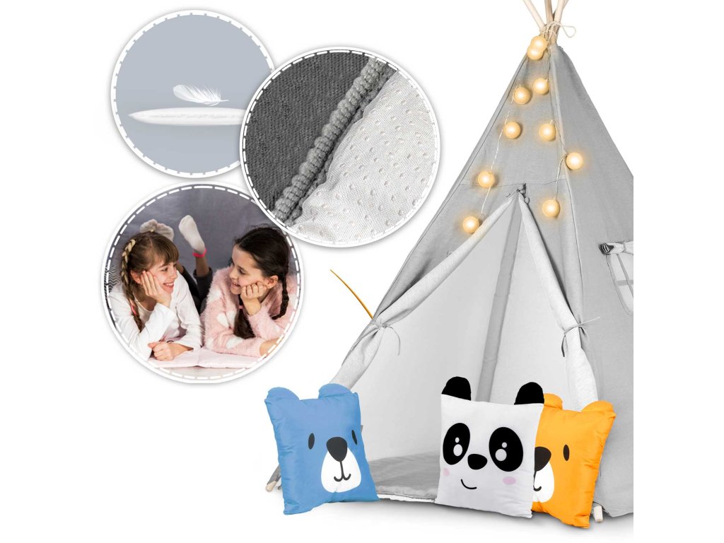 Kako bi igra bila još ugodnija, uz teepee dodajemo jastuke i izolacijsku podlogu s protukliznim ispupčenjima.