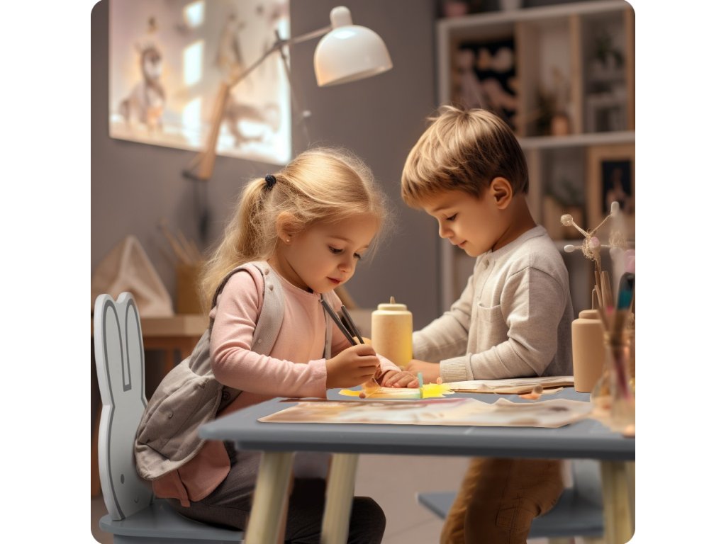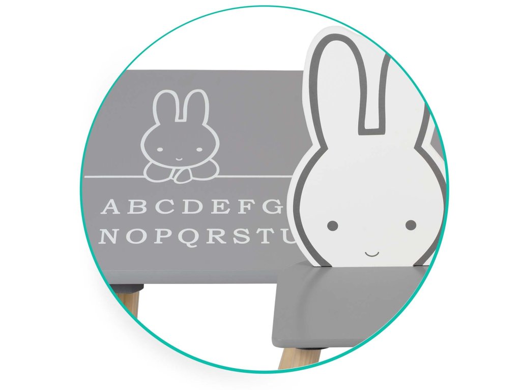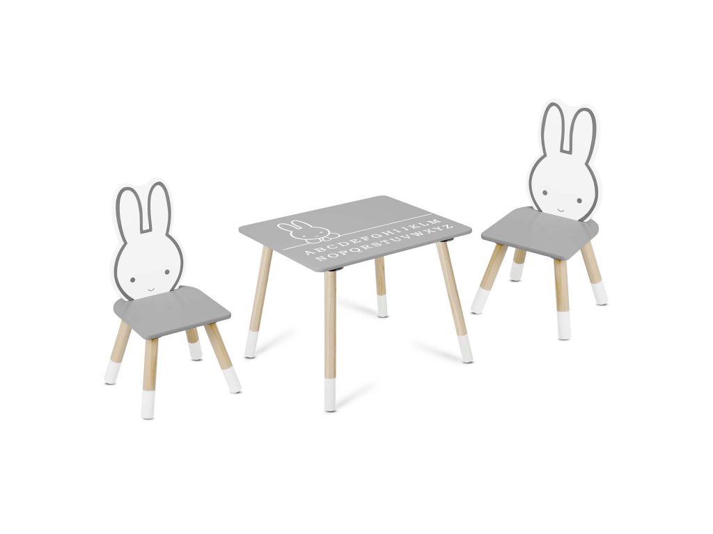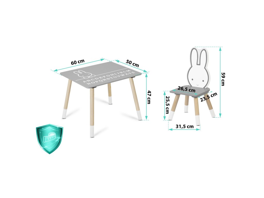 Na stolu je abeceda koja potiče učenje slova , a stolice su u obliku nasmijanih zečića, koji će zasigurno privući vašu malu!