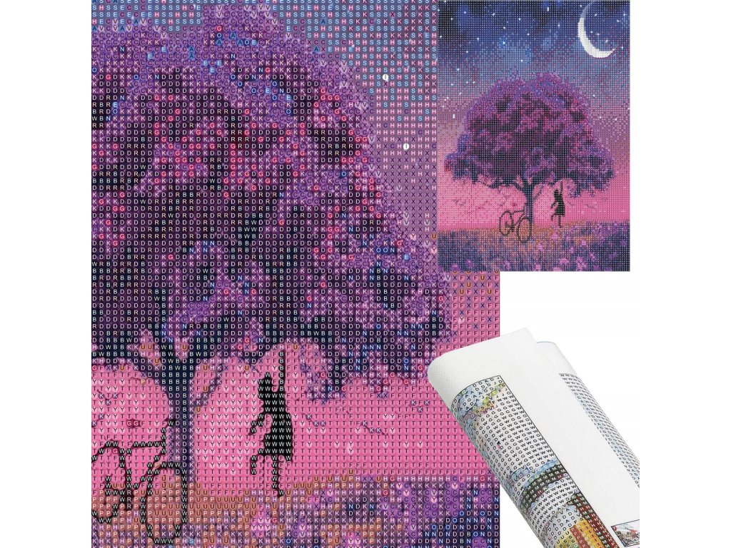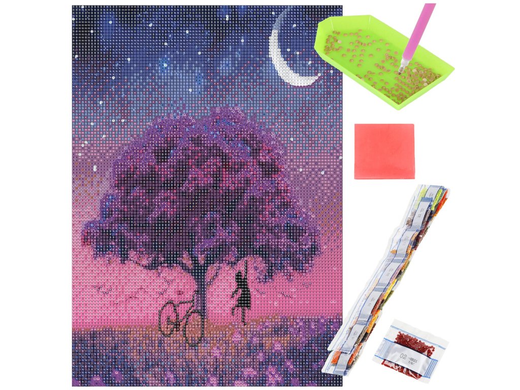 - 1x snažno platno s otisnutom slikom, prikazujući drvo i indeks koji povezuje slova s bojama, a boje s brojevima koji određuju boju dijamanta