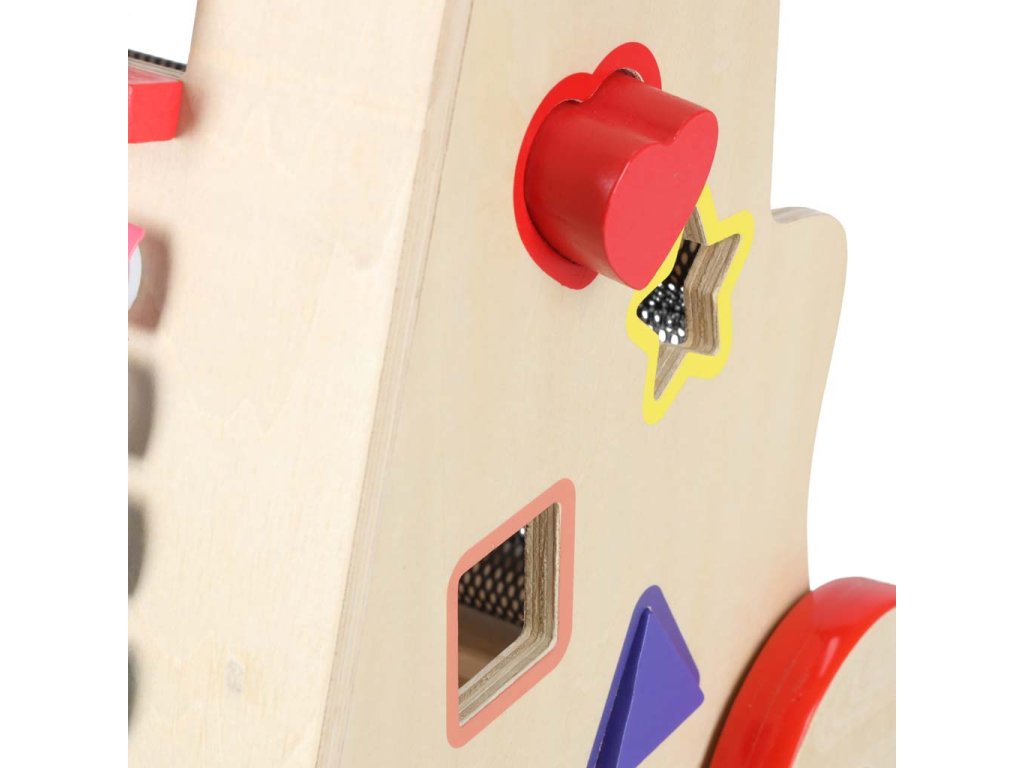 Šareni elementi privlače oko i male ruke svojim bojama. Zahvaljujući neutralnoj drvenoj osnovi, igračka istovremeno ne pruža pretjerane podražaje djetetu.