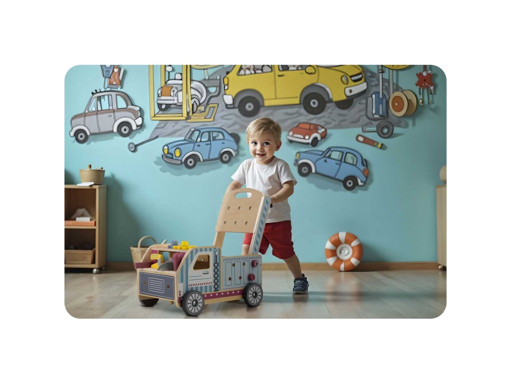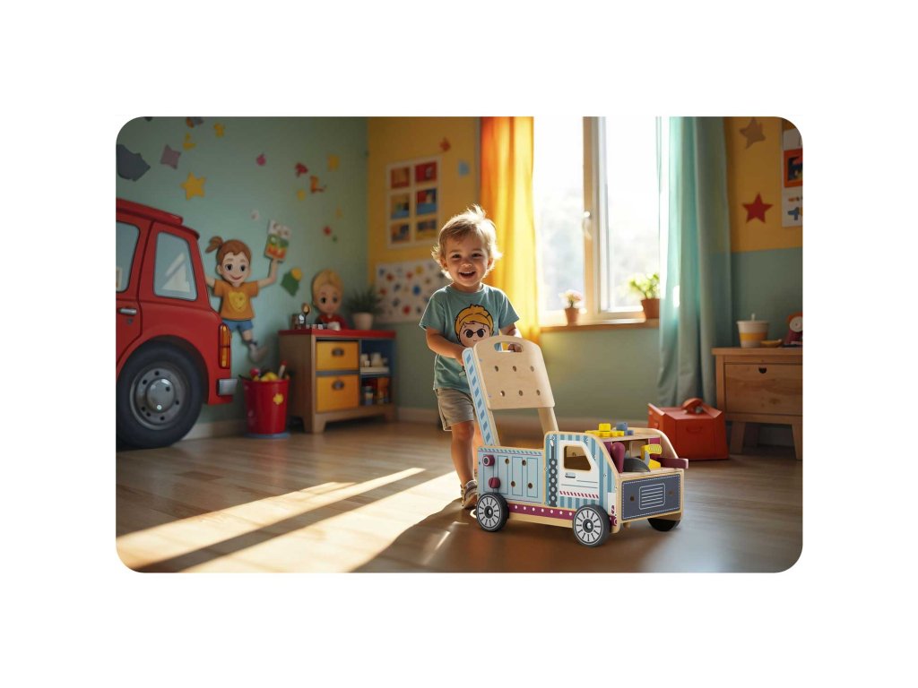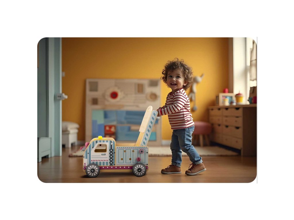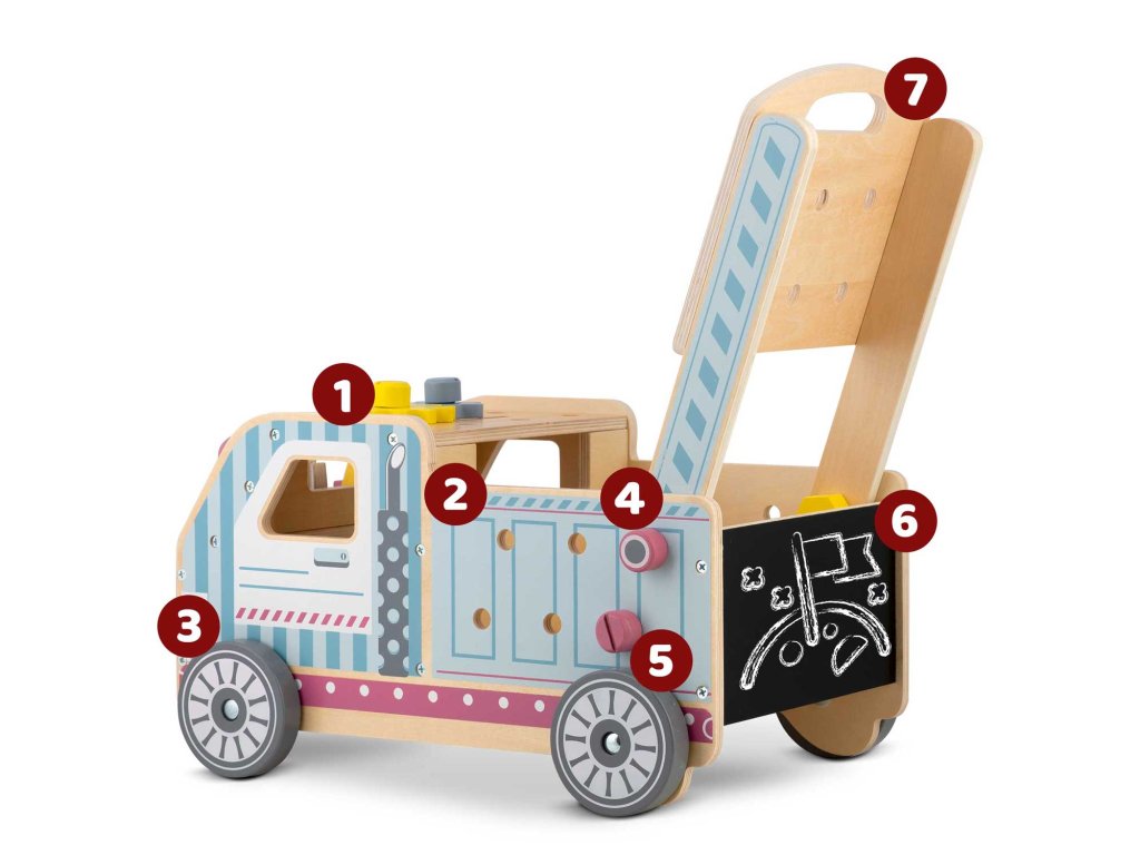 - omogućuje djetetu da vodi igračku, potičući aktivnu igru i razvoj hodajućih sposobnosti