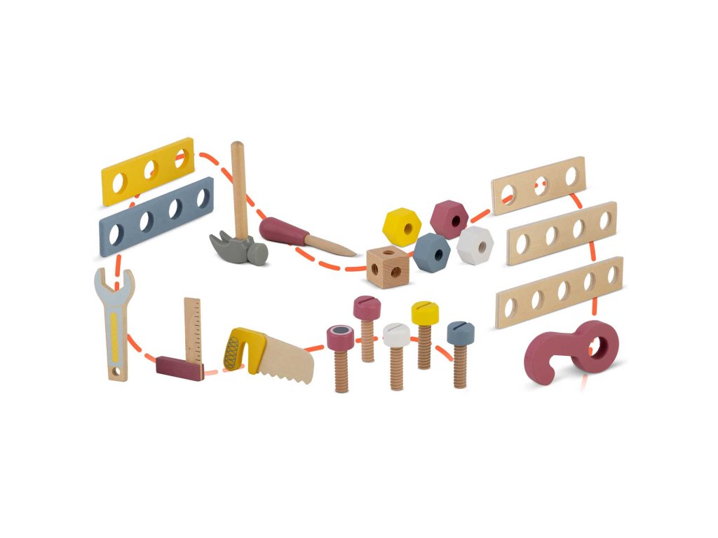 Set sadrži alate, vijke i građevne elemente. Pružit će mnogo sati zabave.