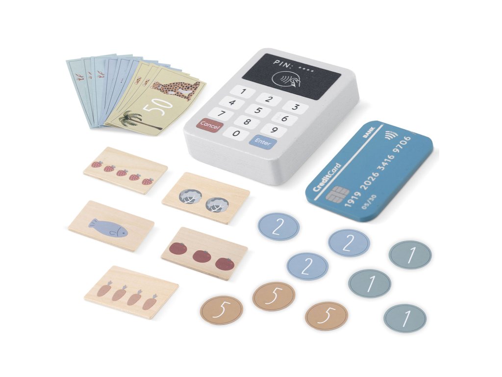 - Brojne kovanice i novčanice za igru i učenje jednostavnog računanja.