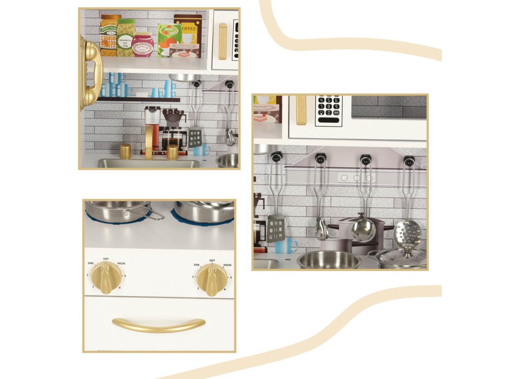 Mnoštvo pokretnih elemenata, poput otvarajućih ormarića ili pokretnih gumba, omogućuje djetetu osjećaj kao da je u pravoj kuhinji. Osim toga, šarena grafika dodaje cijeloj kuhinji realističnost. Na zidu možete vidjeti slike raznih namirnica, aparat za kavu, kuhinjski napu i ostale kuhinjske dodatke.