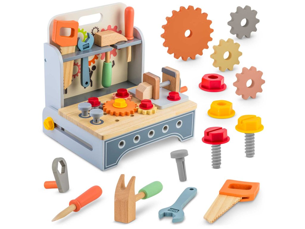 Predstavljamo radni stol za djecu, opremljen policama i setom alata koji podsjećaju na stvarne, ali izrađene od plastike jednostavne za održavanje.