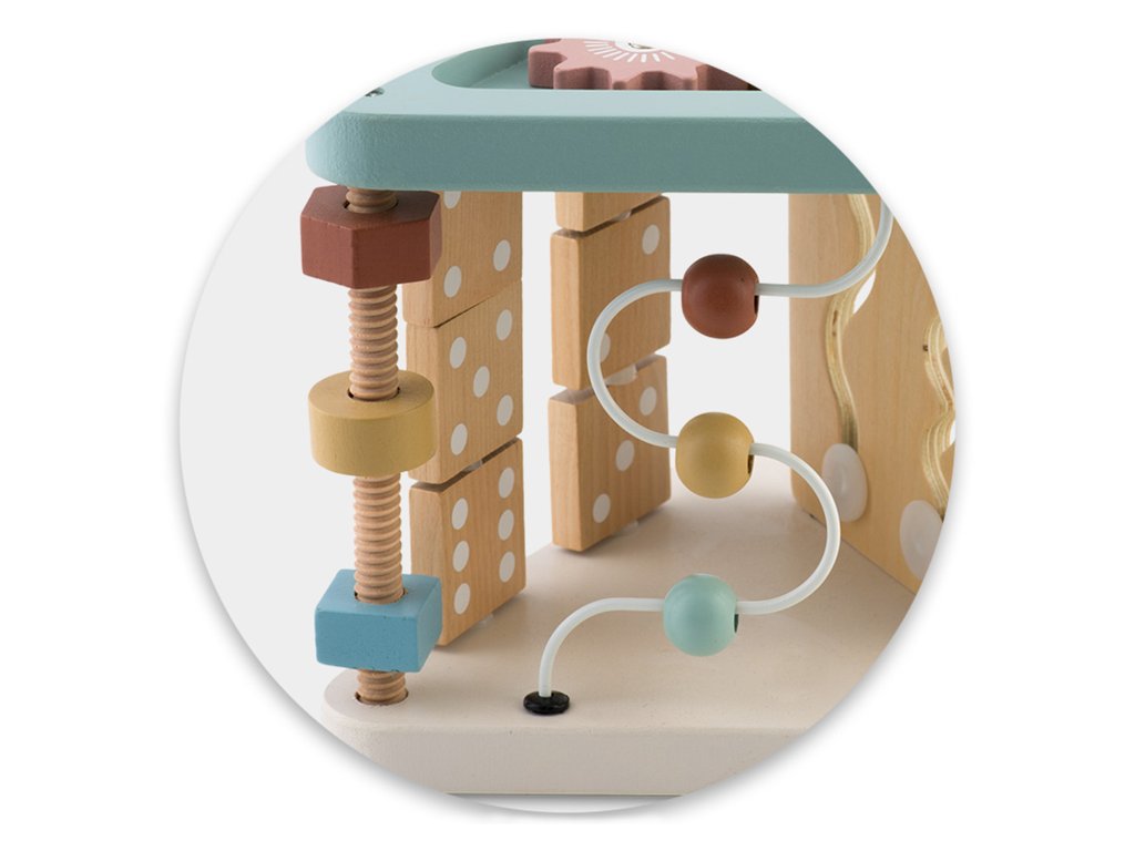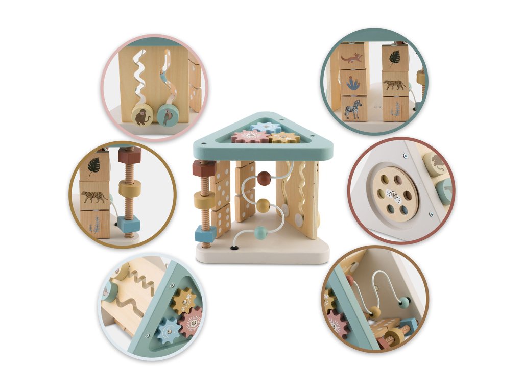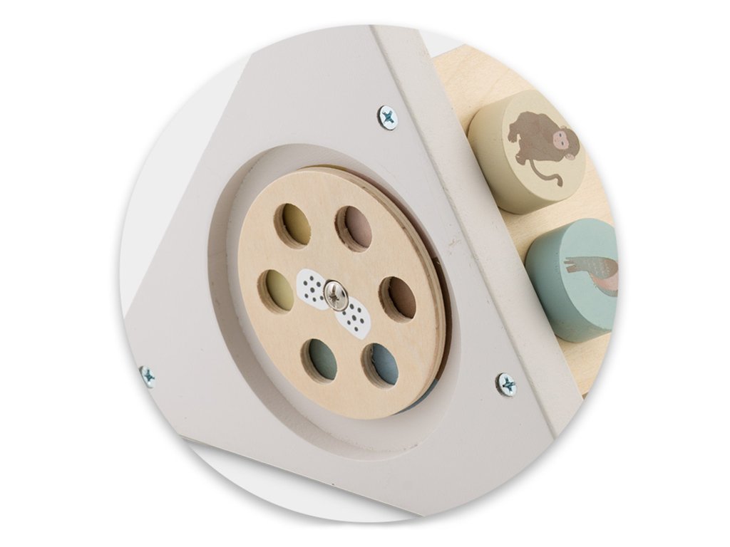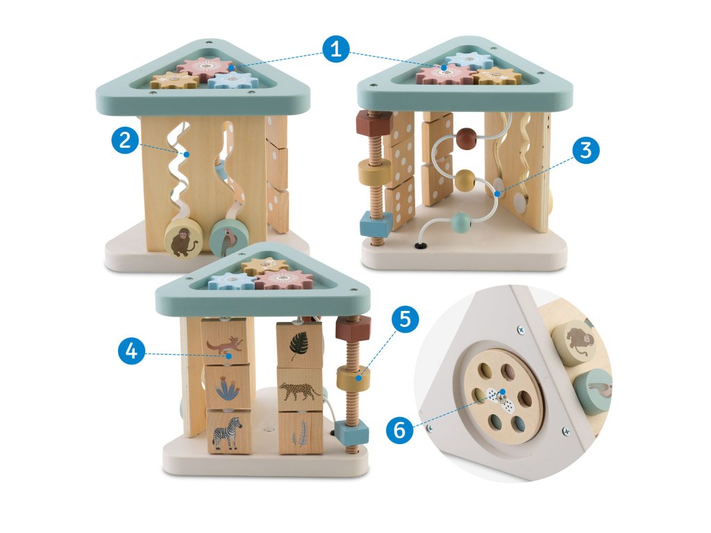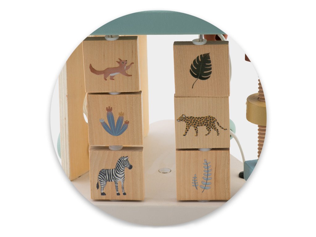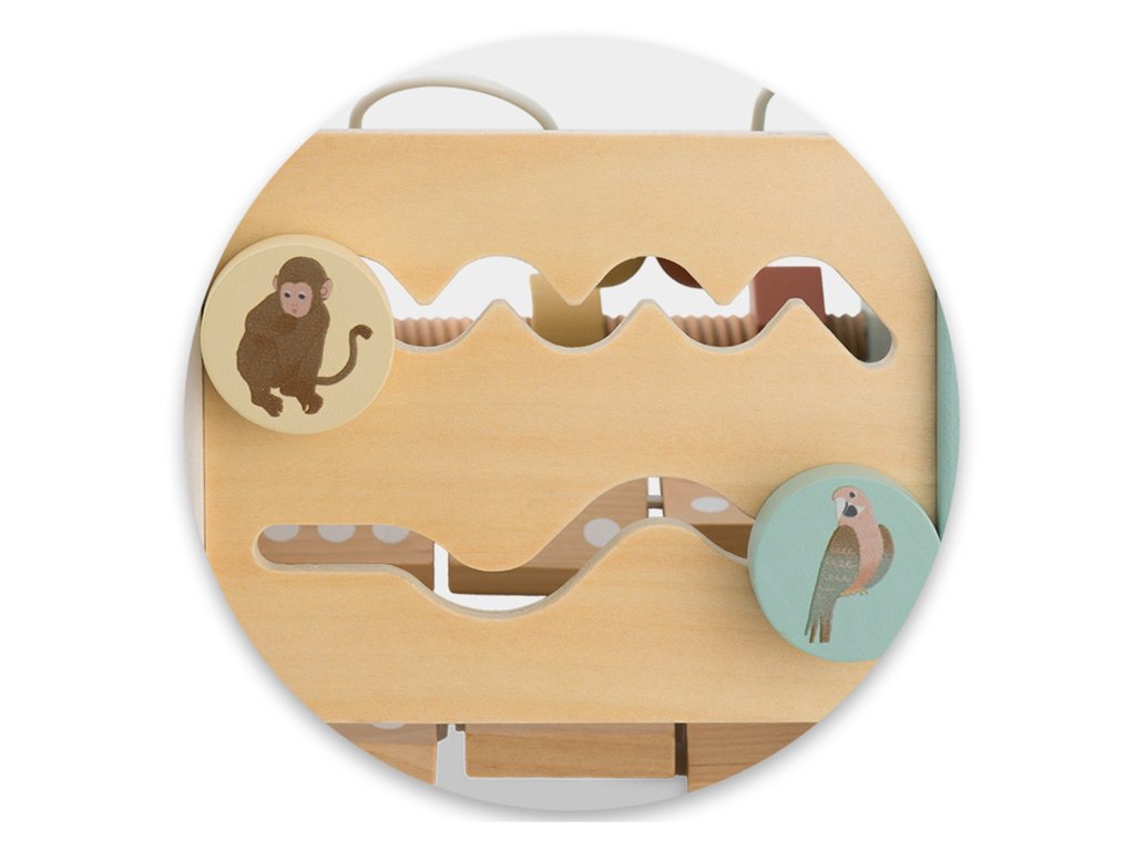 Bočne strane igračke ukrašene su pomičnim kockama s ilustracijama životinja, što može poslužiti kao polazište za učenje naziva životinja, razvoj vokabulara i poticanje mašte.