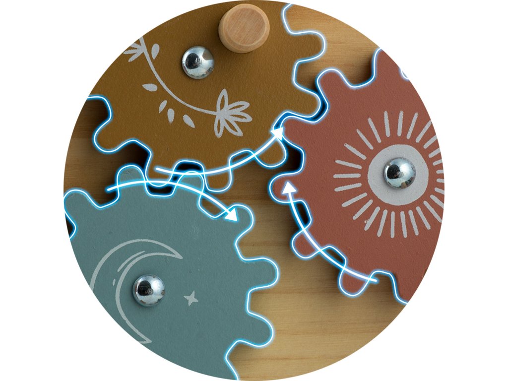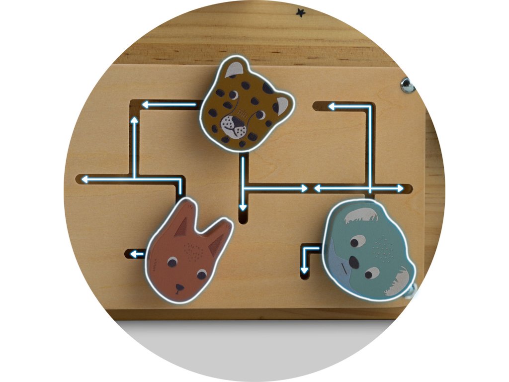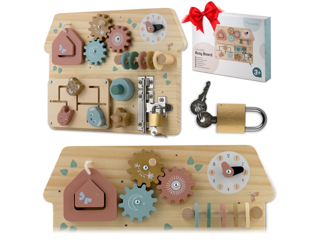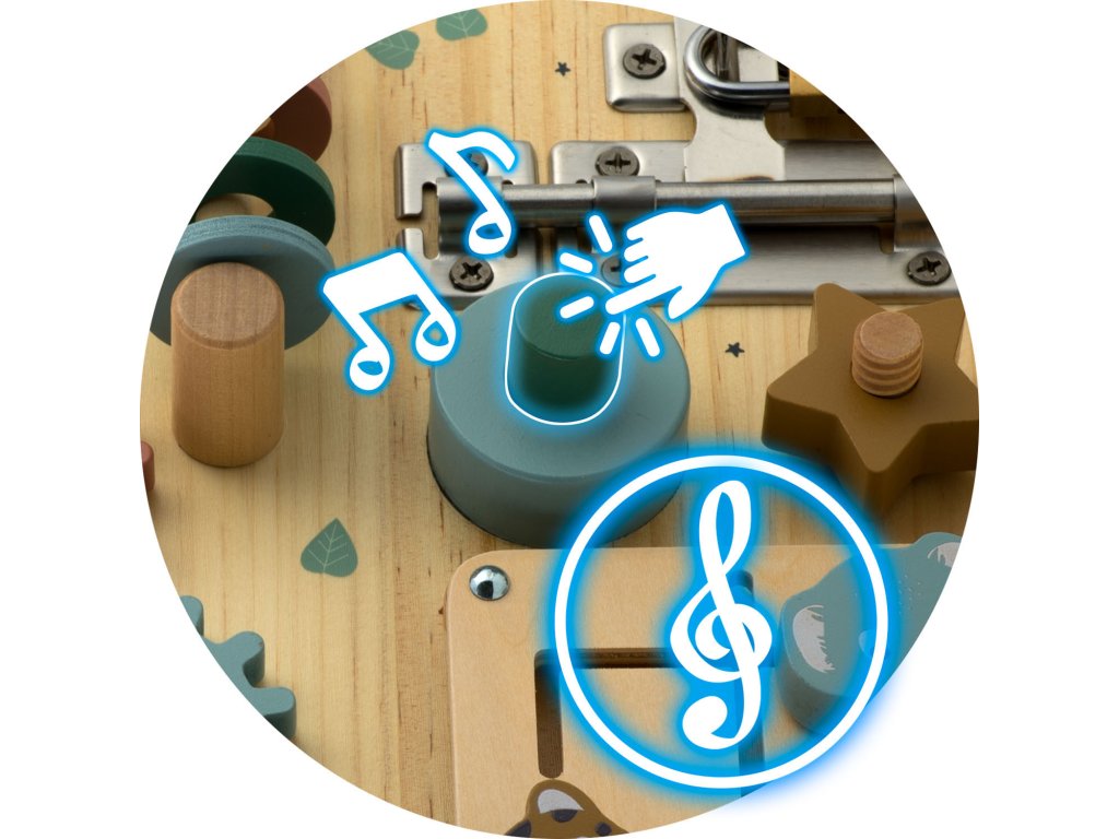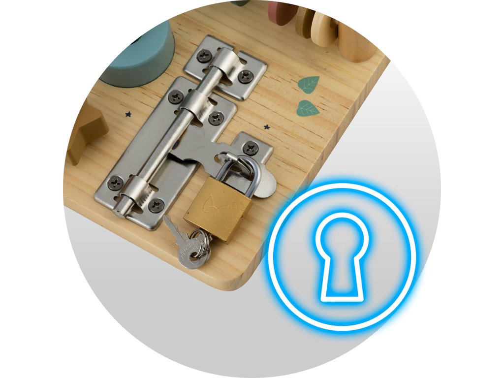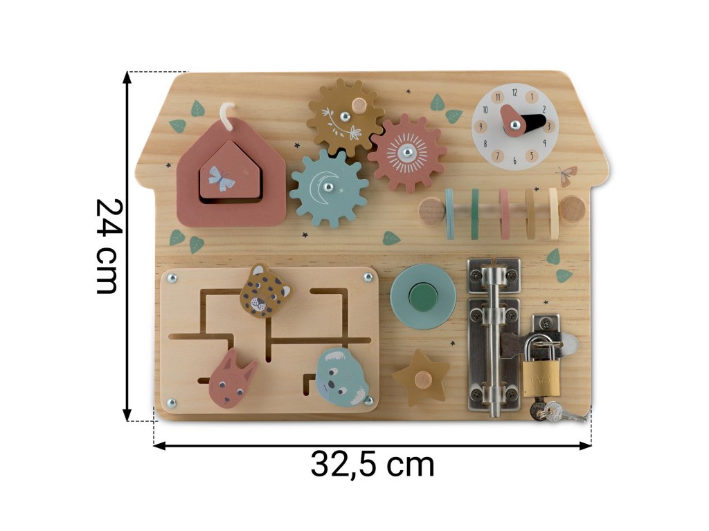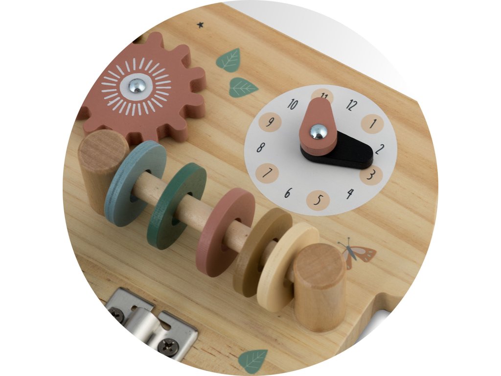 Ploča opremljena raznim mehanizmima, poput bravica, zupčanika i tipki, podržava razvoj preciznih motoričkih vještina.