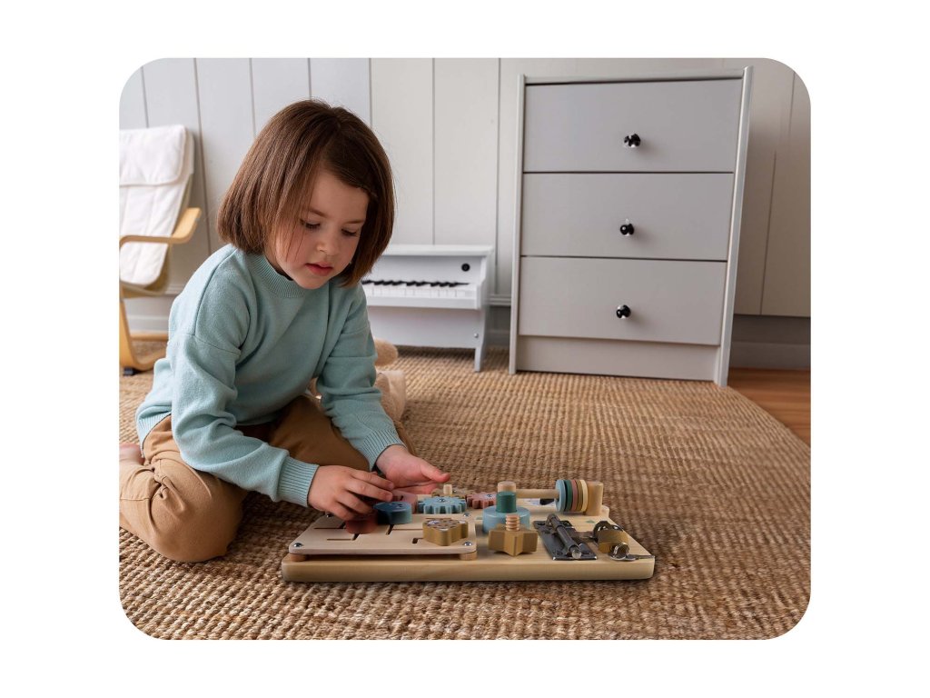 Senzorna ploča inspirirana Montessori metodologijom podržava učenje kroz aktivnosti, omogućujući djetetu da samostalno otkriva funkcije svakog elementa.
