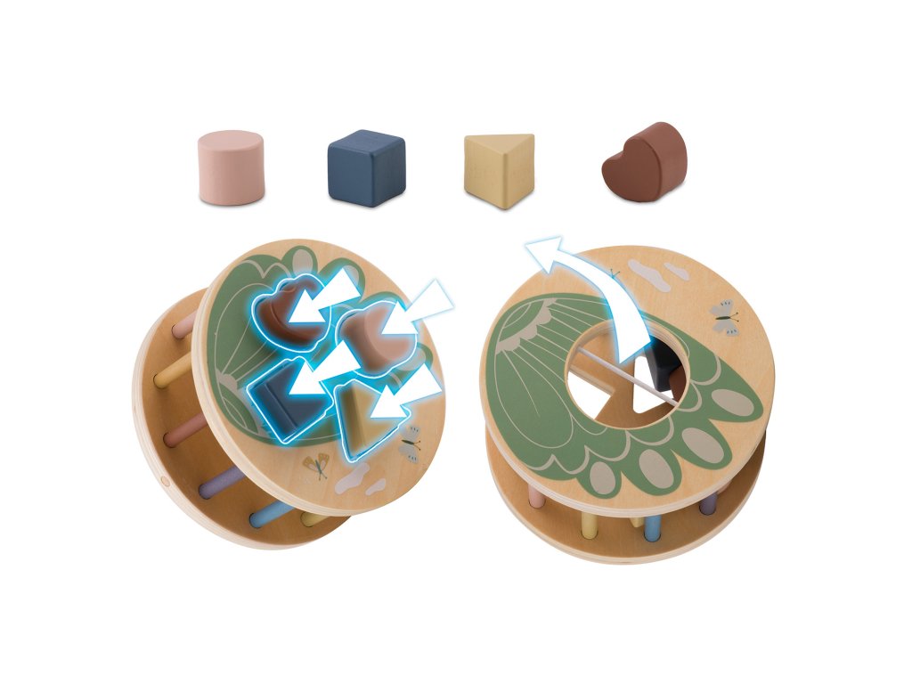 - Rotirajuća ploča dodaje element izazova i inovacije tradicionalnoj igrački tipa sorter oblika. Dijete mora ne samo pridruživati oblik, već i okretati ploču da pronađe pravi otvor, što može doprinijeti boljem planiranju i vještinama rješavanja problema.