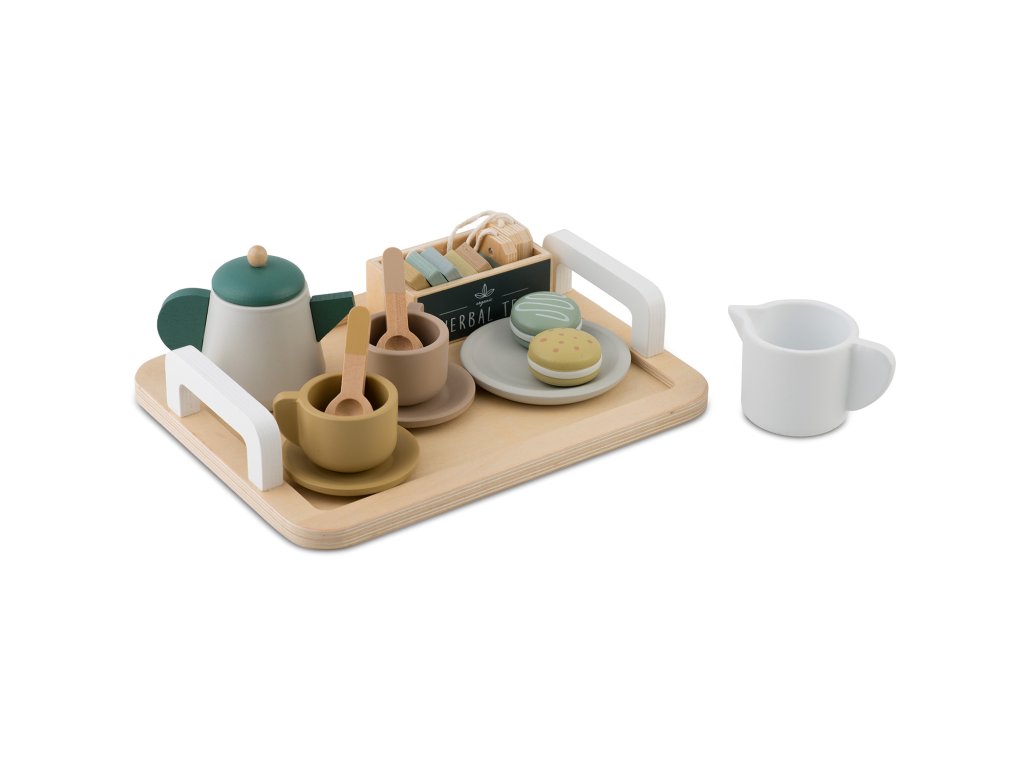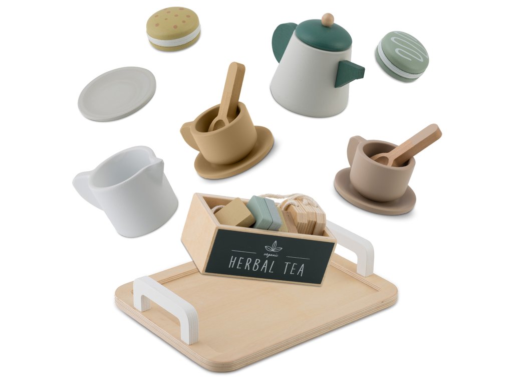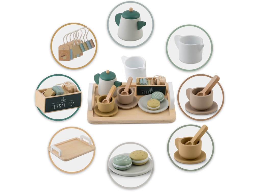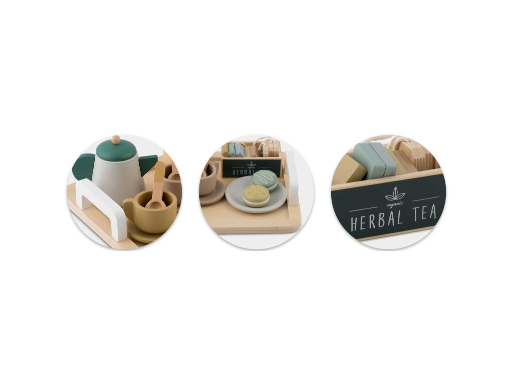 U setu se nalaze visokokvalitetni drveni elementi, kao što su čajnik, šalice, žličice ili pladanj za posluživanje. Može se na njemu posluživati i makroni, a u šalice staviti priložene čajne vrećice, što dodaje cijeloj sceni autentičnost i omogućuje djetetu organiziranje elegantnih zabava.