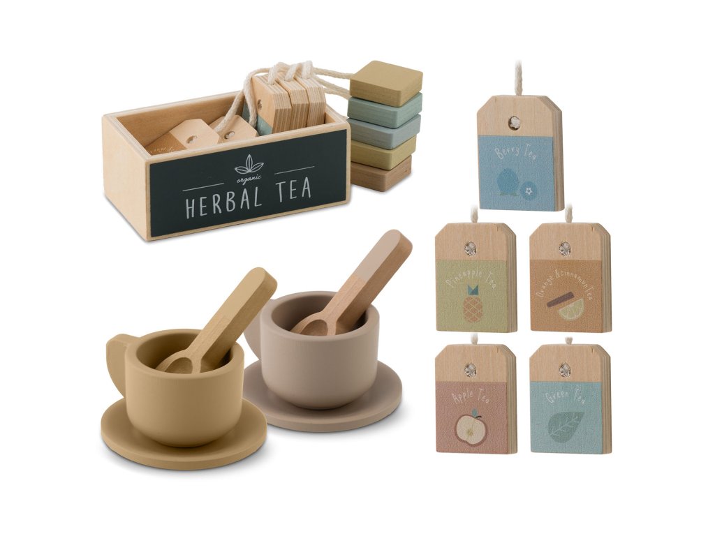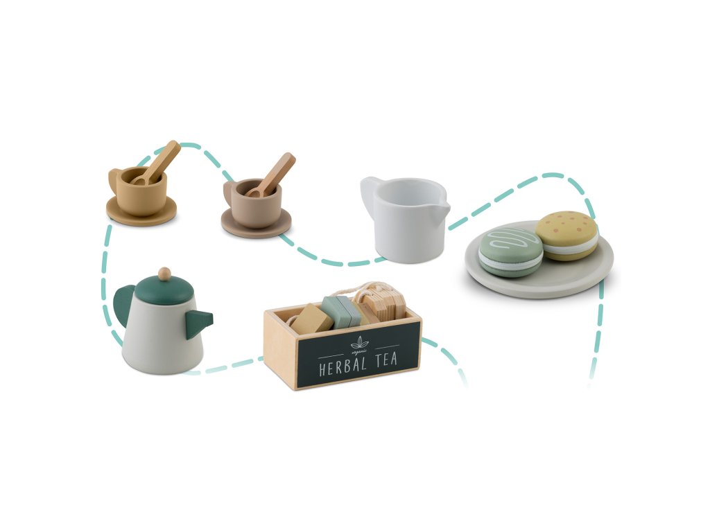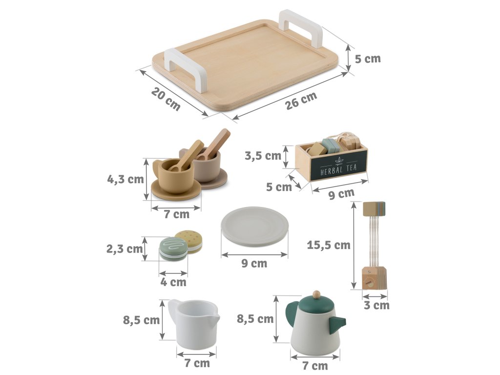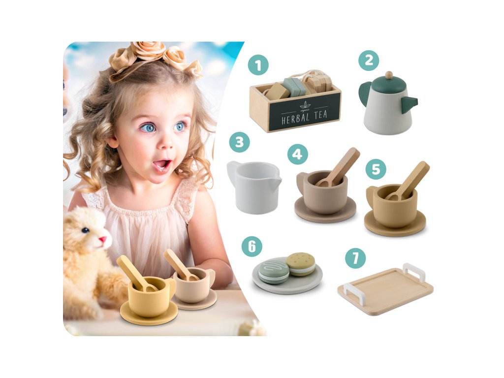 U setu se nalaze visokokvalitetni drveni elementi, kao što su čajnik, šalice, žličice ili pladanj za posluživanje. Može se na njemu posluživati i makroni, a u šalice staviti priložene čajne vrećice, što dodaje cijeloj sceni autentičnost i omogućuje djetetu organiziranje elegantnih zabava.
