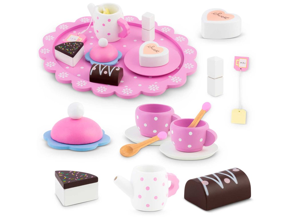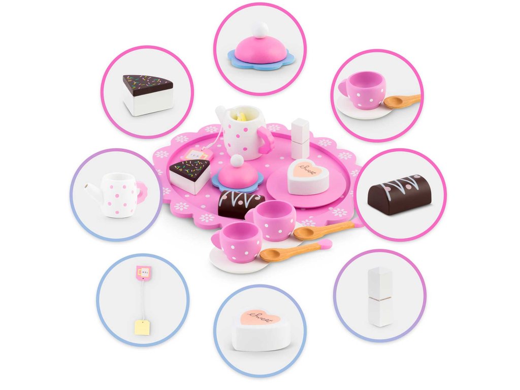 U setu se nalaze visokokvalitetni drveni elementi, kao što su čajnik, šalice, žličice ili poslužavnik. Na njemu možete ponuditi kekse i u šalice staviti priložene vrećice s čajem, što dodaje cijeloj sceni autentičnost i omogućuje djetetu da organizira elegantne prijeme.