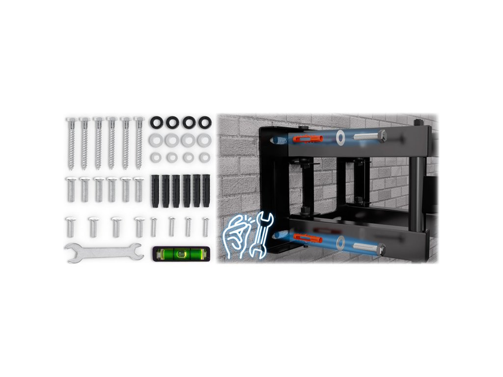 U pakiranju ćete pronaći kompletan montažni set — vijci, tiple, podloške i alati koji olakšavaju instalaciju. Nosač se može montirati na svaku vrstu zida — betonski, gipsani ili zid od opeke. Montaža je brza i jednostavna, traje samo trenutak, čak i bez specijalizirane pomoći.