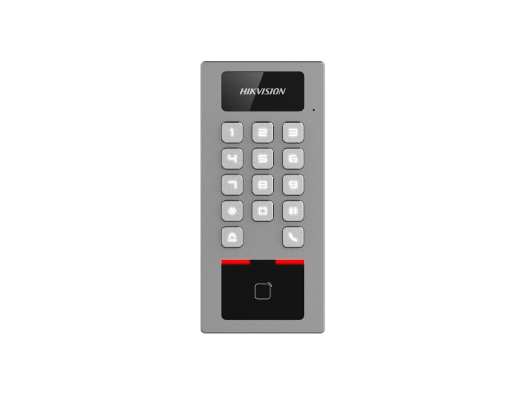 Model DS-K1T502DBWX marke Hikvision je vanjska stanica koja istovremeno djeluje kao terminal za kontrolu pristupa kao i IP ulazna stanica. Terminal je opremljen s dva sučelja za autorizaciju ulaza: