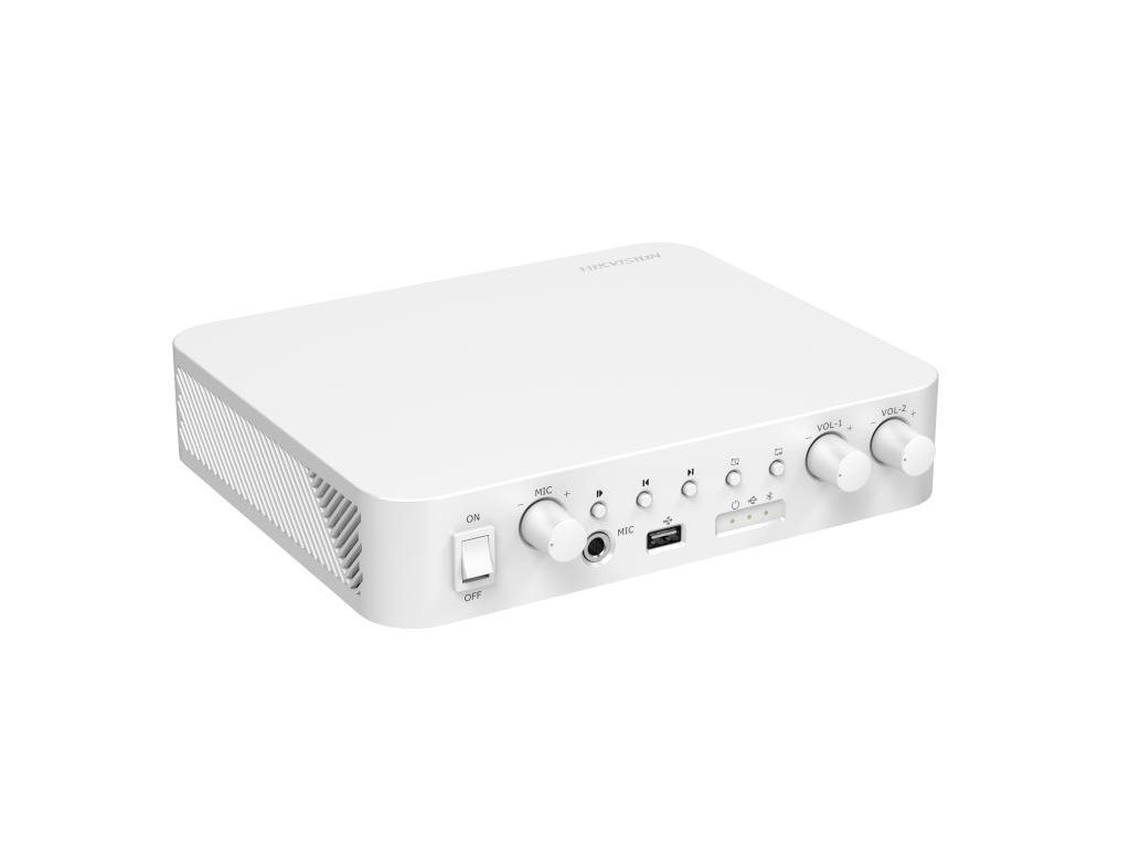 DS-QAE0A60G1-VB je analogni audio amplifikator tvrtke Hikvision. Amplifikator ima mogućnost odabira različitih audio izvora, putem Bluetootha, USB 2.0 porta, RCA ulaza i mikrofonskog ulaza. Možete mu priključiti zvučnike s impedancijom 4 (2x 30W), 8 (2x 15W), kao i 100V zvučnike s mogućnošću stvaranja 2 zone s neovisnim kontrolama glasnoće.