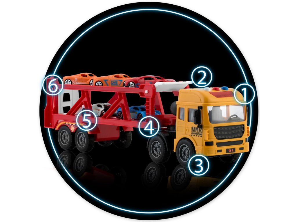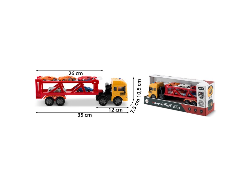 Komplet sadrži sportske modele autića, koji se mogu prevoziti na šlep službi ili se s njima igrati samostalno.
