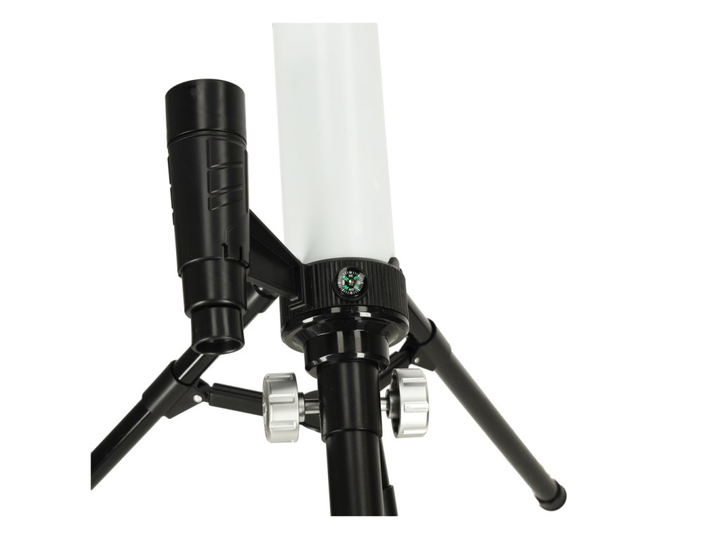stalak, koji omogućuje precizno postavljanje uređaja i ugodno promatranje tijekom dužeg vremena. Uz to,ugrađeni kompas pomaže jednostavno usmjeriti teleskop u pravom smjeru, tako da se dijete brzo nauči pravcima i orijentaciji na nebu. Set uključuje i