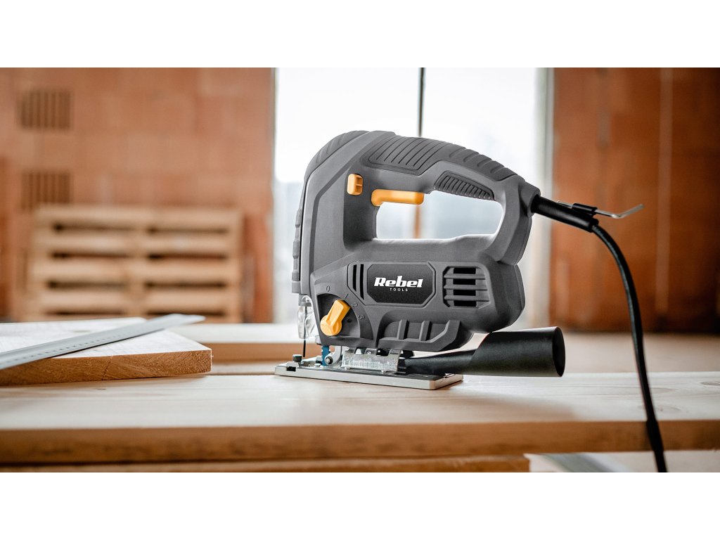 Ako volite provoditi vrijeme u kućnim radovima, izrađujući rezove i ukrase u drvu, plastici ili metalu, udarna pila Rebel Tools 850 W ispunit će vaša očekivanja. Sigurna zamjena noža bez upotrebe alata u kombinaciji s laserskim navođenjem za precizno rezanje olakšat će vam bilo koji posao u udobnosti vaše radionice.Ovisno o željenom učinku, možete koristiti jednu od četiri postavke za podešavanje njihanja oštrice. Osim toga, udarna pila Rebel Tools opremljena je podesivim kutom rezanja do 45 stupnjeva s obje strane, što je čini idealnom i za naprednije radove koji zahtijevaju kosine. Kako bi korištenje stroja bilo udobnije, ima adapter za spajanje radionickog usisavača, koji povećava vidljivost rada usisavanjem prašine.
