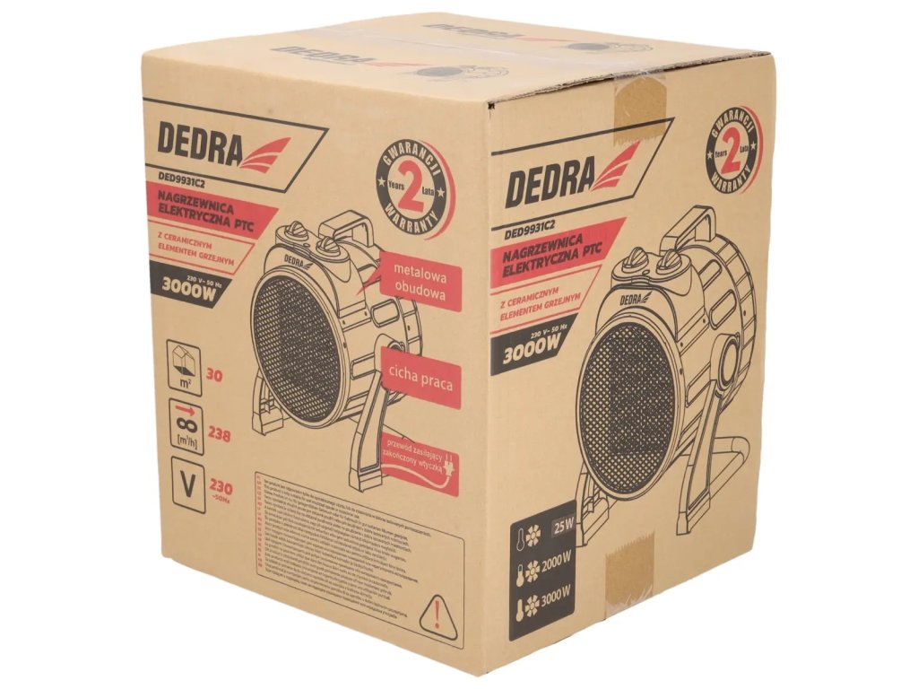 Električni grijač DED9931C 2 je uređaj namijenjen za korištenje u zatvorenim prostorijama. Koristi se za grijanje stambenih i komercijalnih prostora, kao što su podrumi, garaže, radionice itd. Uređaj je namijenjen za korištenje kao pomoćni izvor topline, a ne kao glavni izvor topline. Ako je gumb za temperaturu postavljen na minimalnu razinu, uređaj se ne može koristiti kao električni grijač bez funkcije grijanja. Keramički grijaći element (PTC) čini da je toplina osjetna gotovo odmah nakon uključivanja. Uređaj je tijekom rada tih. Praktična ručka za nošenje.Ovaj proizvod je prikladan samo za povremenu upotrebu ili za korištenje u dobro izoliranim prostorima.