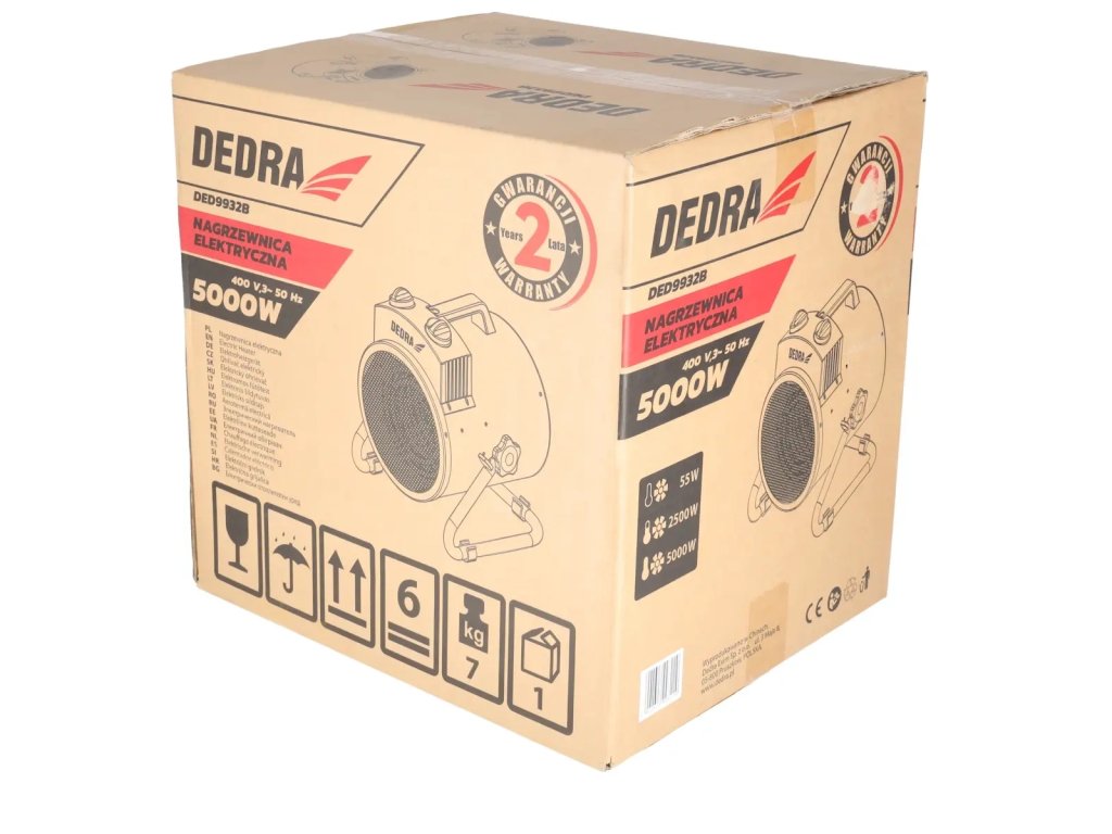 Električni grijač DED9932 B je uređaj namijenjen za korištenje u zatvorenim prostorima. Koristi se za grijanje kućnih i komercijalnih prostora, kao što su podruma, garaža, radionica itd. Uređaj je namijenjen za korištenje kao pomoćni izvor topline, a ne kao glavni izvor topline. Namijenjen je za kontinuirani rad i tijekom rada ne stvara nečistoće niti neugodne mirise. Opremljen je aksijalnim ventilatorom i izdržljivim niskotemperaturnim grijačima. Grijač ima ugrađeni senzor temperature, regulator snage i termostat. Konstrukcija grijača omogućuje i podešavanje kuta strujanja vrućeg zraka. Kada je kontroler temperature postavljen na minimum, uređaj se može koristiti kao ventilator bez funkcije grijanja. Grijač se lako prenosi zahvaljujući maloj težini, malim dimenzijama i praktičnoj ručki.Ovaj proizvod je prikladan samo za povremenu upotrebu ili za upotrebu u dobro izoliranim prostorima.