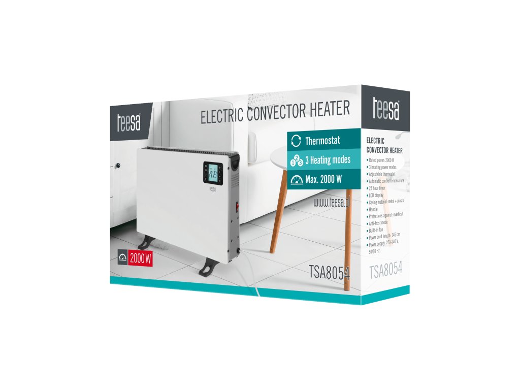 TSA8054 je moderan električni grijač koji zahvaljujući svojoj snazi od 2000 W osigurava učinkovito i brzo grijanje prostorija. Uređaj koristi konvekcijsku tehnologiju, odnosno cirkulaciju zraka, koja omogućava ravnomjerno raspoređivanje topline u prostoriji, što značajno povećava udobnost u hladnim danima.