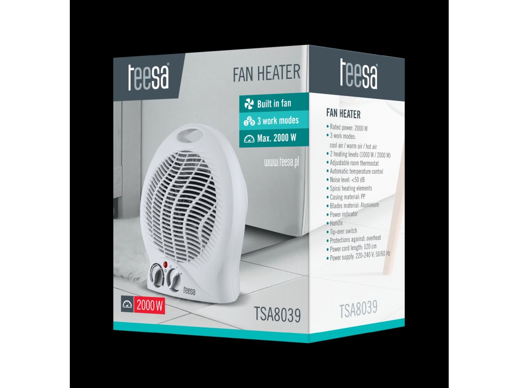 Grijač Teesa TSA8039 s ventilatorom s tri radna načina i izborna snaga grijanja -1000 W ili 2000 W korisna je naprava za zagrijavanje unutarnjih prostora. Ventilator ne samo da ravnomjerno raspoređuje topao zrak, već zahvaljujući funkciji za hladan zrak hladi prostoriju tijekom vrućih dana.