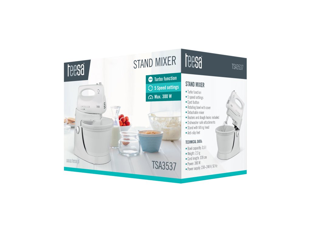 Svaka domaćica zna da je oprema u kuhinji nepotpuna ako među uređajima nema miksera. Zamijenite svoj stari mikser s novim modelom Teesa TSA3537 upravo sada. Za razliku od običnih ručnih miksera, ovaj uređaj ima stabilnu bazu s rotirajućom posudom kapaciteta 3,5 litre, zahvaljujući kojoj kuhinjski poslovi prestaju biti naporni i pretvaraju se u pravu kulinarsku strast. Još jedna prednost je poklopac protiv prskanja koji vam pomaže održati red u kuhinji.