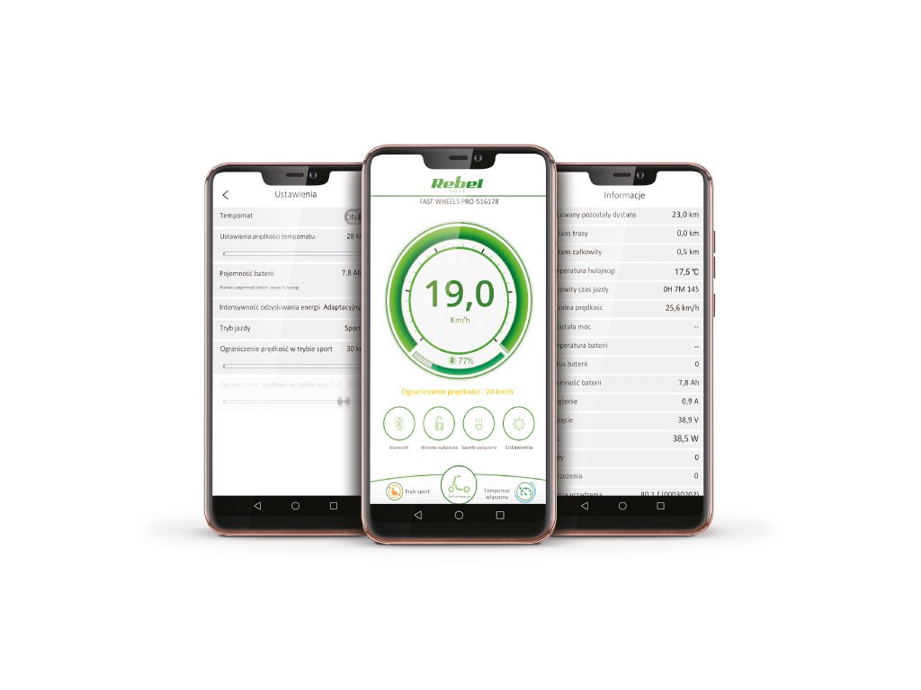 Za romobil Fast Wheels PRO razvijena je posebna aplikacija REBEL Fast Wheels PRO, koja sadrži mnogo korisnih funkcija. Omogućuje ne samo provjeru trenutne brzine, već možete i postaviti ograničenje brzine ili postaviti tempomat. Osim toga, aplikacija izračunava procijenjenu udaljenost koju ćete prijeći na bateriji.