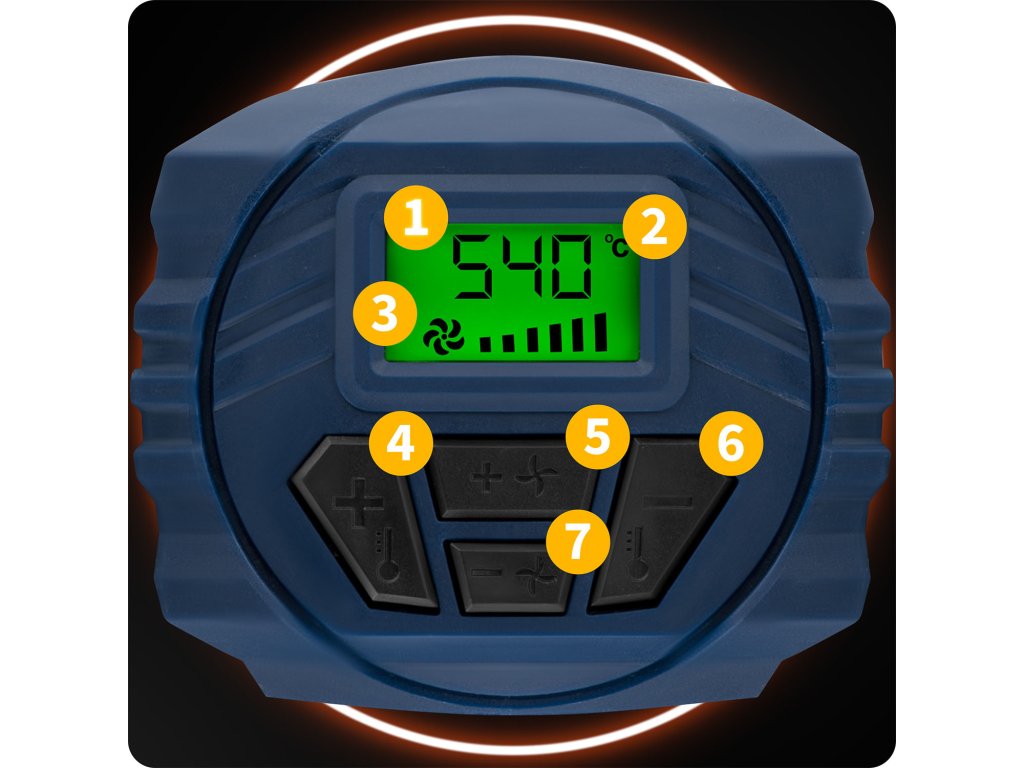 Višeslojno kućište grijača pruža izvrsnu toplinsku izolaciju. Uživajte u snažnom uređaju i istovremeno sigurnosti. Vanjsko kućište s zaštitom za ruku, izrađeno od materijala PP i drška se ne grije, zahvaljujući čemu možete iskoristiti potencijal toplotne puške potvrđene marke Humberg.