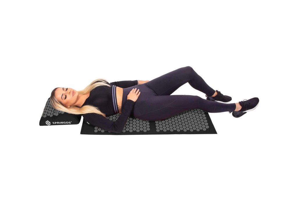 - Pamučne navlake podloge i jastuka izrađene su od crnog materijala, našiveni su diski s bodljama crne boje. Na navlakama je otisnut bijeli logo Springos, a na podlozi je prišivena bočna etiketa s logom.