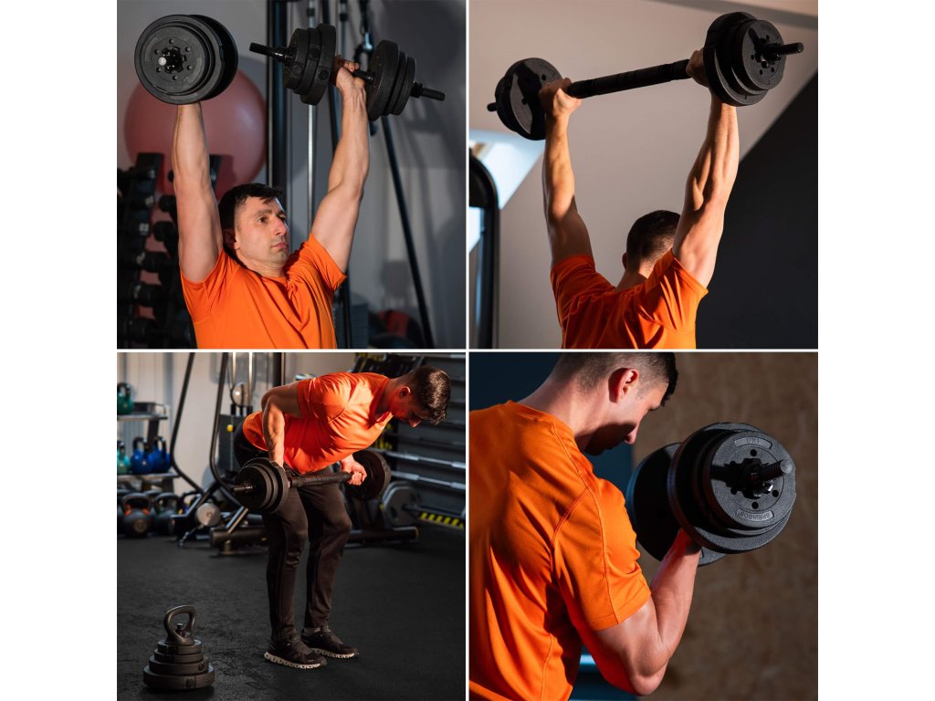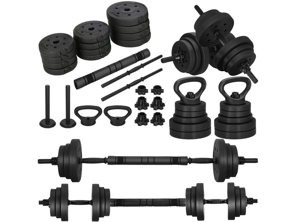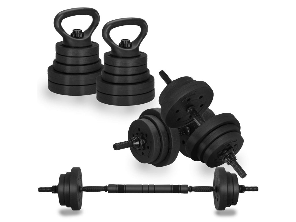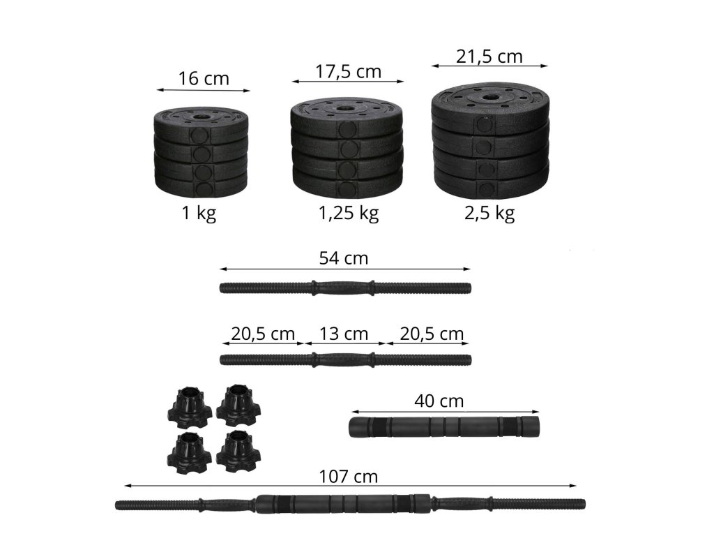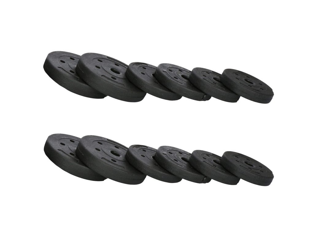 - Težina pojedinih diskova: 4x 2,5 kg; 4x 1,25 kg; 4x 1 kg