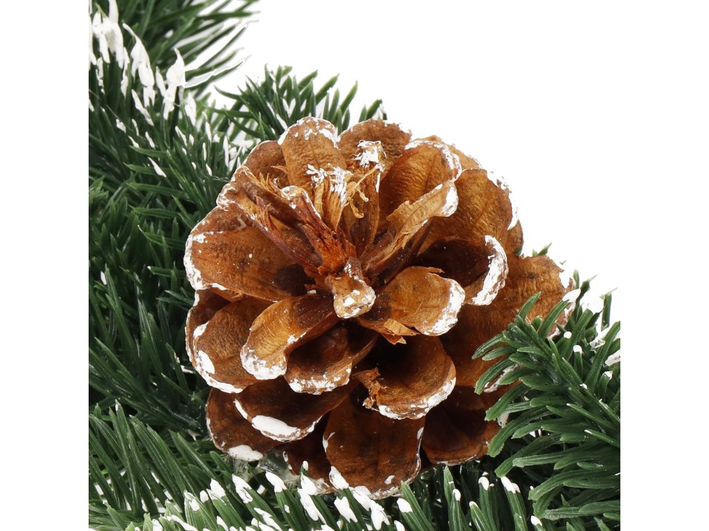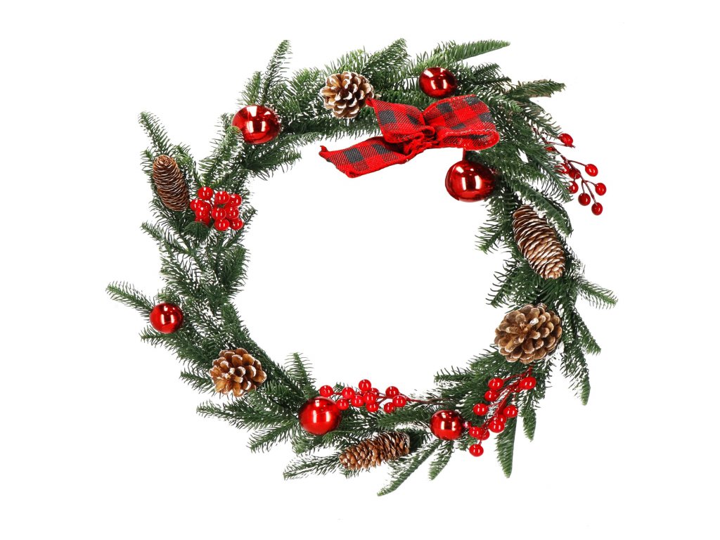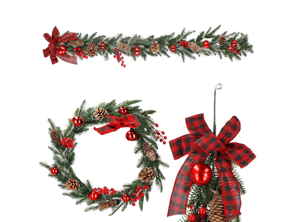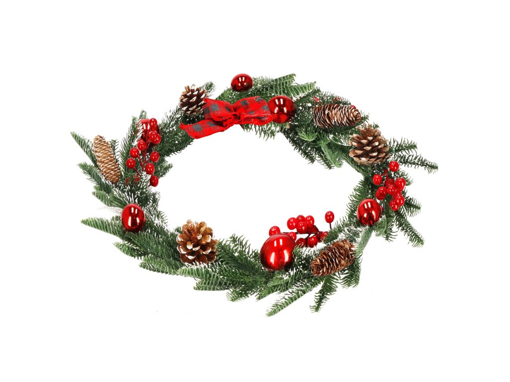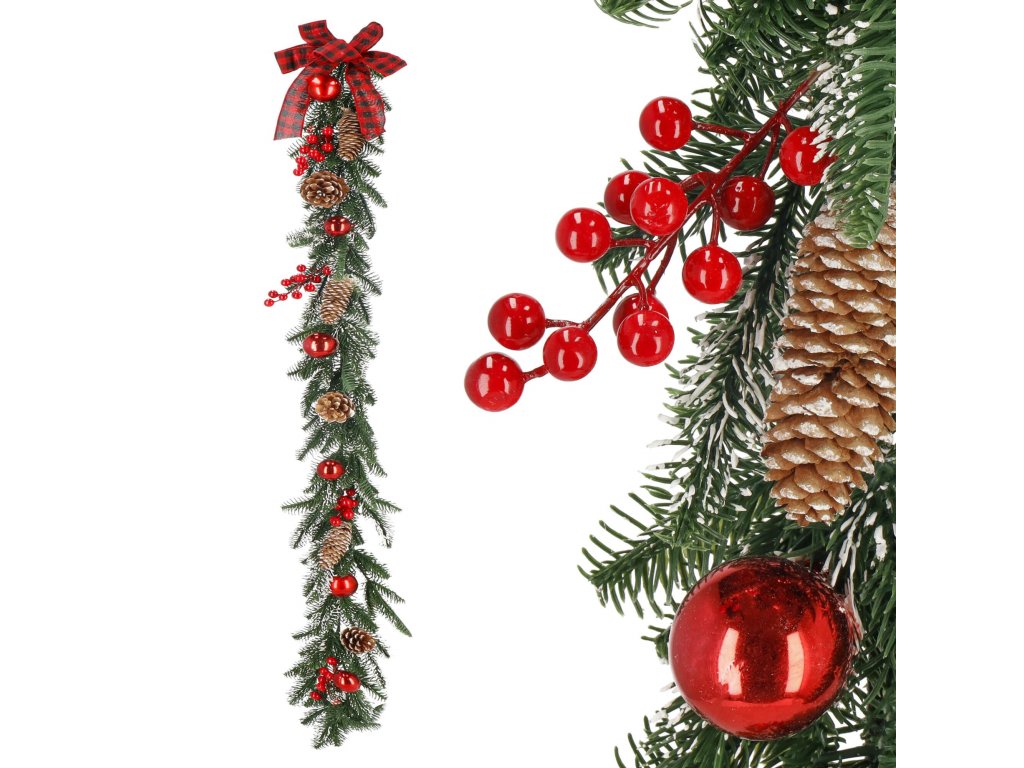 Uzorak: girlanda ukrašena češerima, grančicama rowanije i crvenim kuglicama;karirana mašna na jednom kraju