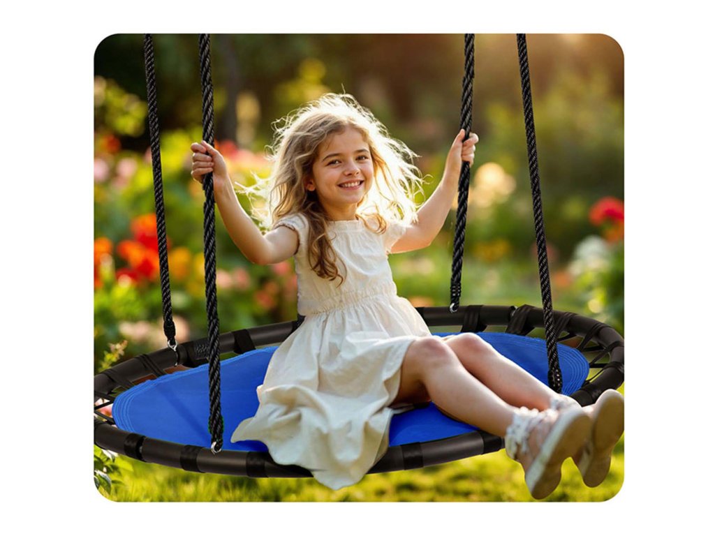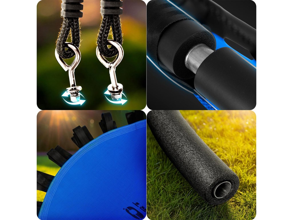 Ljuljačka na čeličnom okviru prekrivena mekom zaštitnom PE pjenom s višestrukim šavovima i debelim visećim užadima. Osigurava sigurnost, stabilnost i trajnost.