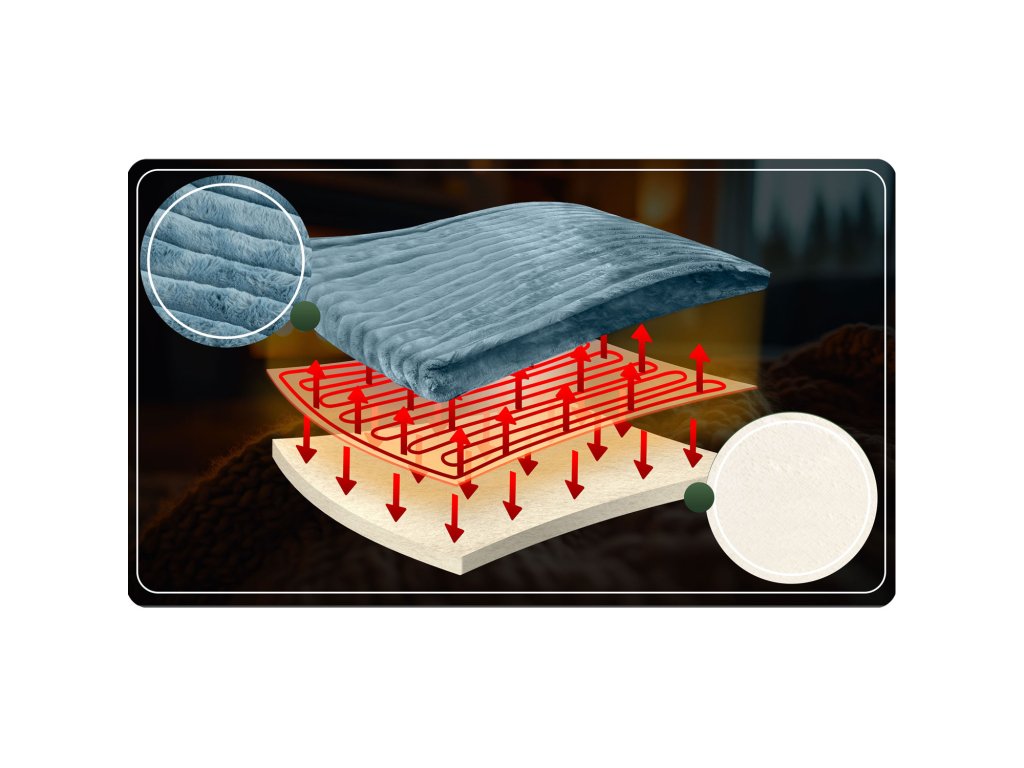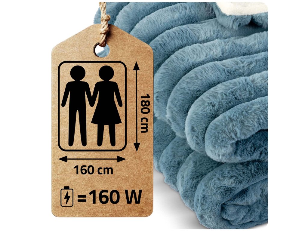 - Pokrov dimenzija 180 x 160 cm dovoljno je velik da udobno zagrije dvije osobe, a njegova debljina (550+220 g/m ) osigurava ugodnu toplinu i bez uključenog grijanja. Idealno za hladne večeri provedene zajedno.