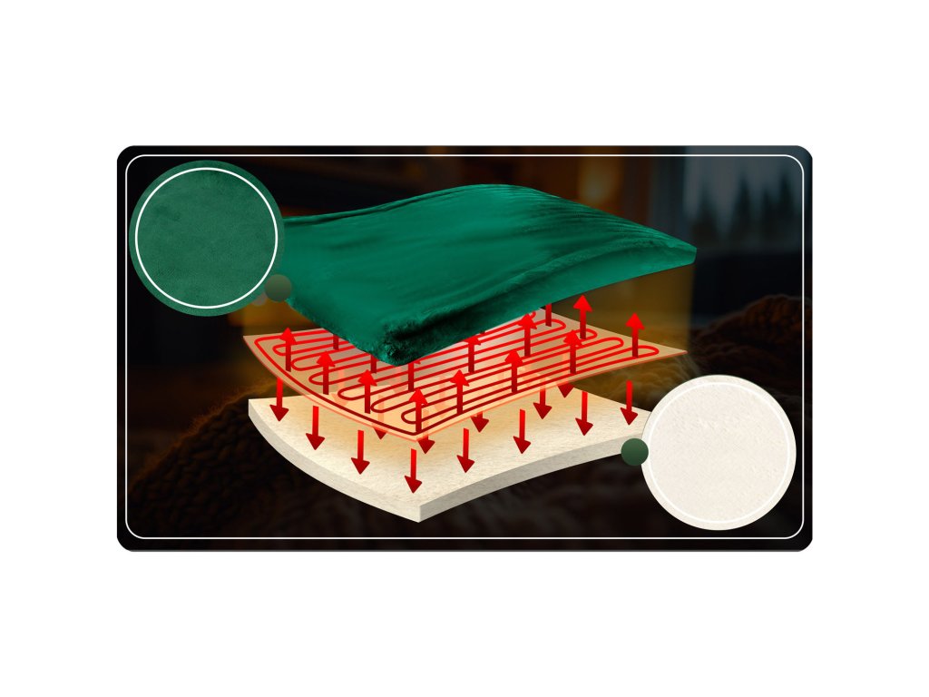 - Pokrov dimenzija 180 x 160 cm dovoljno je velik da ugodno grije dvije osobe, a njegova debljina (270+220 g/m ) znači da čak i bez uključivanja grijanja pruža ugodnu toplinu. Idealno za hladne večeri provedene zajedno.