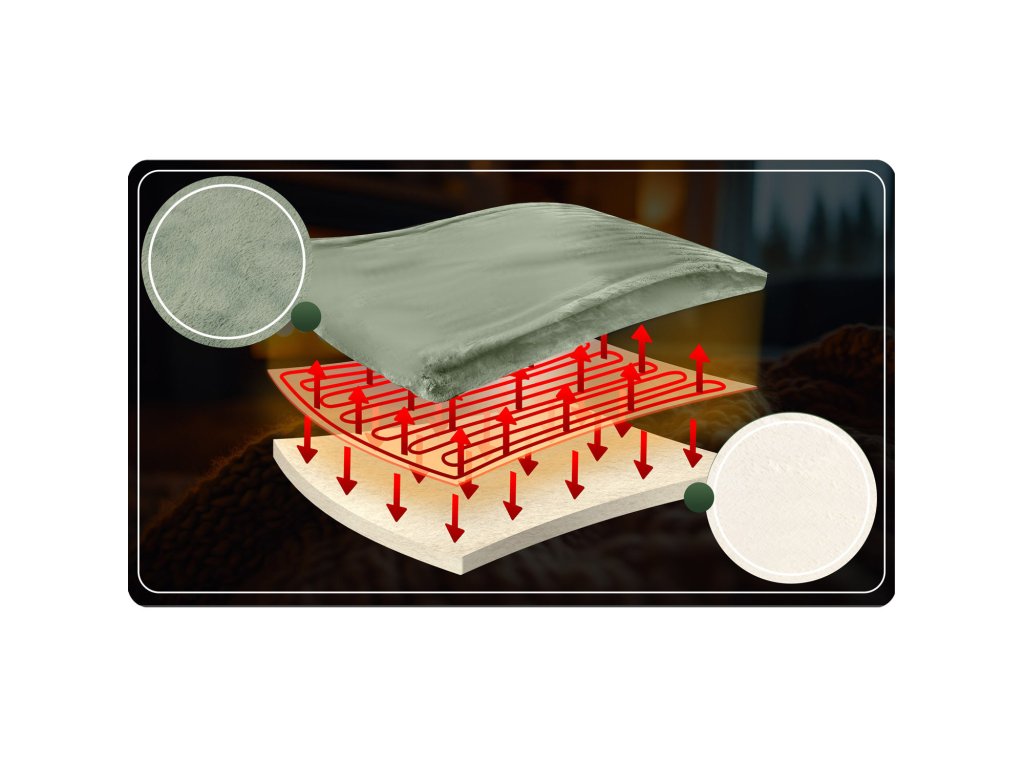 Električni pokrivač ima ugrađene grijaće kanale , koji proizvode i ravnomjerno raspoređuju toplinu .