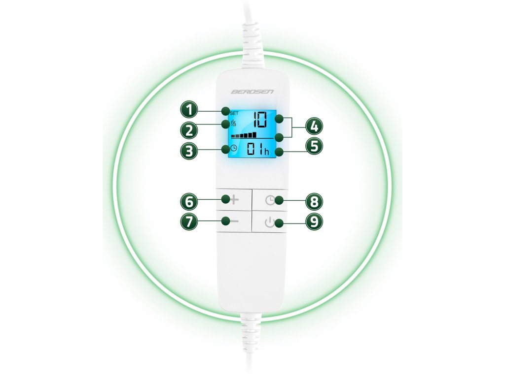 - Pozadinsko osvjetljenje LCD zaslona olakšava upravljanje postavkama temperature čak i u mraku radi povećanja udobnosti. U kombinaciji s visokom snagom od 160 W pokrivač osigurava trenutno zagrijavanje i preciznu regulaciju temperature.