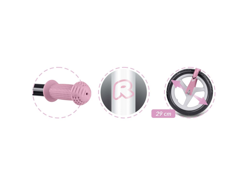 - Kotači: veliki, čvrsti kotači od EVA pjene s dugotrajnim gumama, osiguravajući stabilnost i glatkoću vožnje. Tih rad tijekom vožnje znači da balans bicikl nije neugodan za uho čak ni tijekom vožnje u kući.
