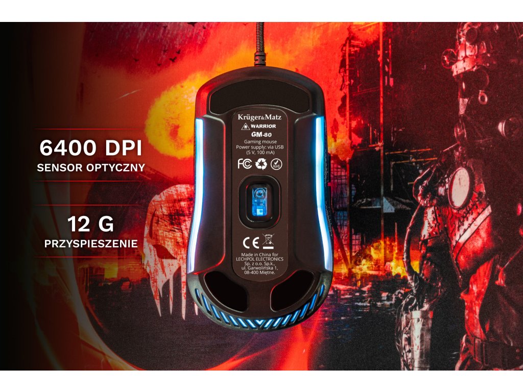 Akcesoria gamingowe nie tylko muszą być komfortowe w użyciu i funkcjonalne - oryginalny design jest równie ważny. Myszka dla graczy Kruger&Matz Warrior GM-80 posiada wielokolorowe podświetlenie, które z pewnością uatrakcyjni wygląd Twojego sprzętu komputerowego.