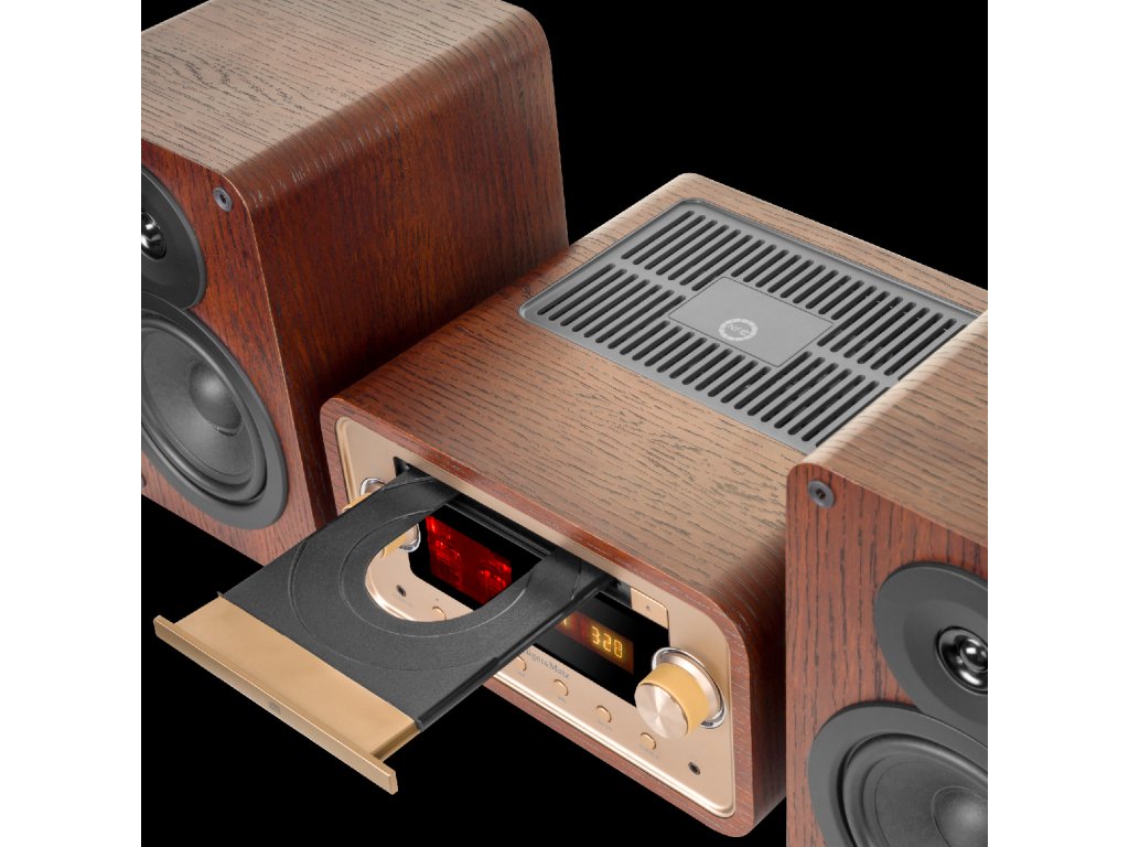 Kućni audio uređaj mora impresionirati ne samo visokom kvalitetom zvuka, već i sofisticiranim dizajnom. Elegancija drvenih zvučnika i središnje jedinice savršeno je naglašena jantarnim sjajem svjetiljki. Ova kombinacija je savršen dodatak vašem dnevnom boravku.