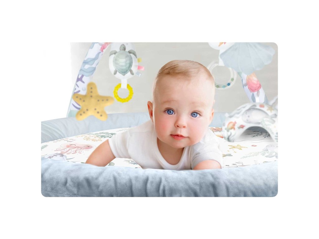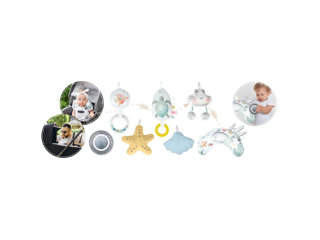 Zato na podlogu pričvršćujemo multifunkcionalne igračke , koje možete objesiti na trake - neka nešto zvecka, zvoni, ili nešto šuška! Uključena je čak i igračka zviždaljka - rak!