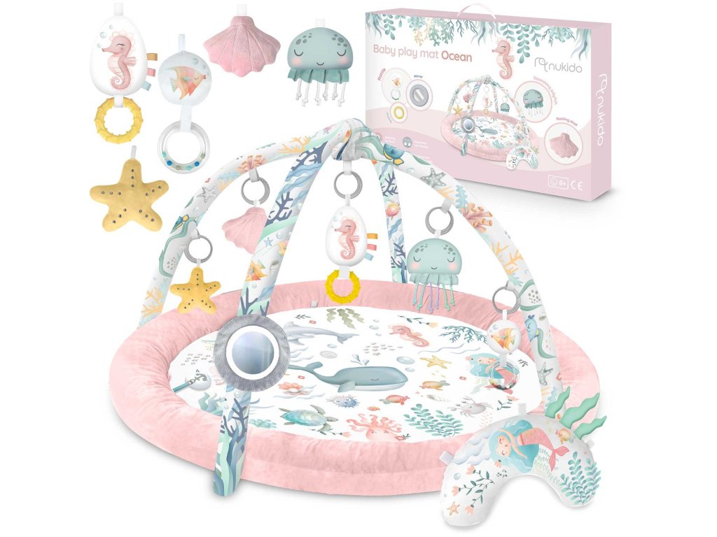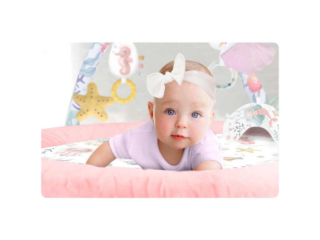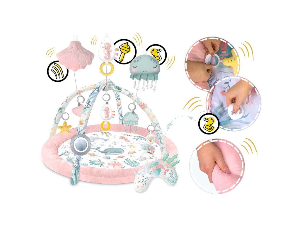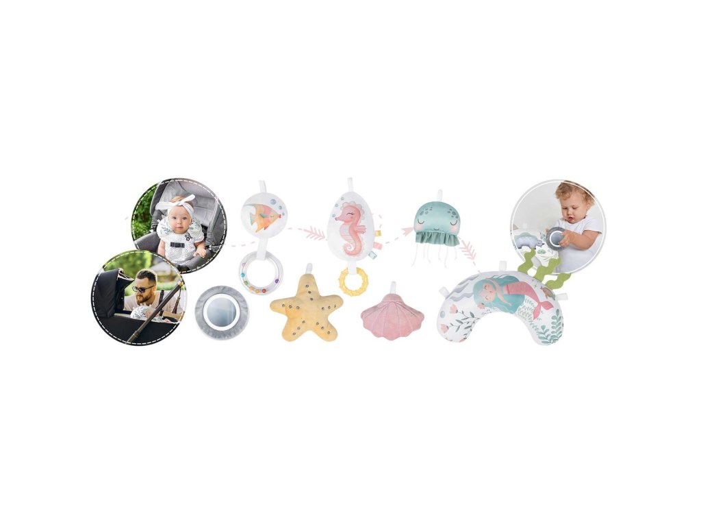 Zato pričvršćujemo višenamjenske igračke na prostirku koje možete objesiti na trake - neka nešto zvecka, zvoni ili šuška! Među igračkama je čak i igračka s pištalicom - rak!