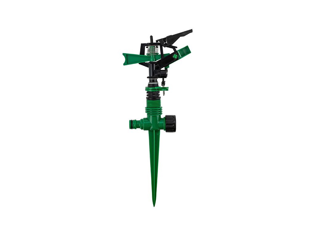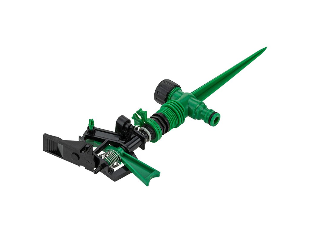 Izrađen od visokokvalitetne plastike. Ukopan u zemlju s dugim, čvrstim šiljkom. Prskalica ima ručno podešavanje kontrolnog sektora u obliku odbojnika, što omogućuje podešavanje kuta okretanja prskalice od 30° do 360°. Za postizanje efekta prskanja od 30°, postavite odbojnik između najužih zaustavljanja, a za postizanje 360° prskanja podignite odbojnik. Osim toga, prskalica ima podesiv krov koji vam omogućuje lako ograničavanje dometa prskanja njegovim podizanjem i spuštanjem.