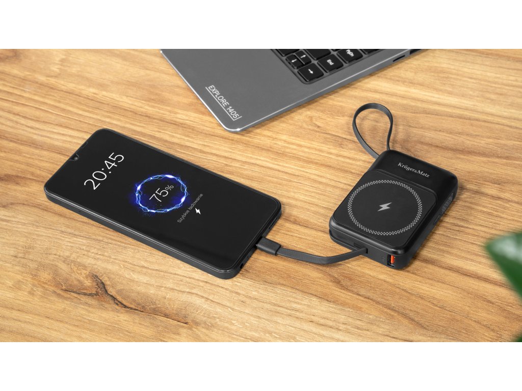 Trebate li odjednom napuniti više od jednog uređaja Nema problema! Power bank Kruger&Matz omogućuje punjenje dvaju uređaja istovremeno – kako žičano, tako i bežično. Zahvaljujući tome možete podijeliti energiju s bližnjima ili istovremeno napajati telefon i druge dodatke. To je maksimalna funkcionalnost zatvorena u kompaktnoj i elegantnoj kućišti.