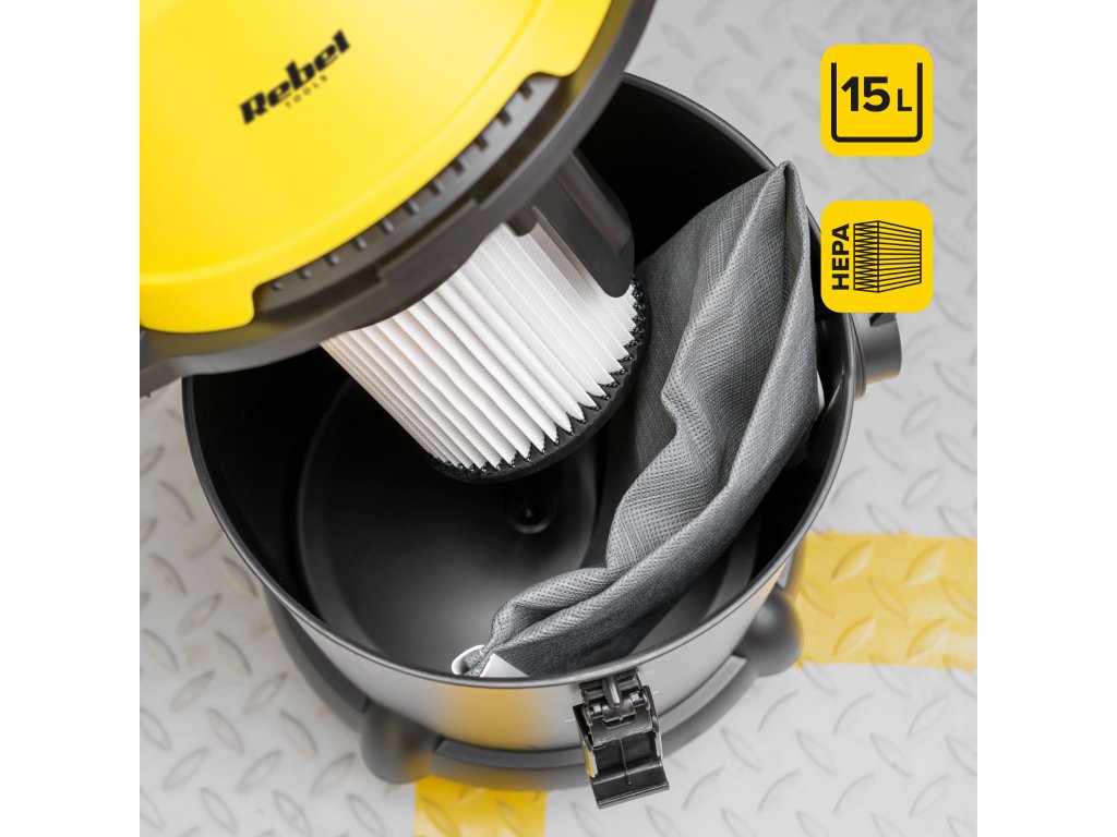Industrijski usisavač Rebel ima veliki spremnik od 15 litara za nečistoće, što vam omogućuje dugotrajan rad bez potrebe za pražnjenjem. Trebali biste se usredotočiti na univerzalni HEPA filter, koji je prikladan za suhe i mokre nečistoće. Usisavač dolazi s 4 zamjenjive mlaznice, koje vam omogućuju uklanjanje nečistoće s različitih površina i teško dostupnih mjesta.