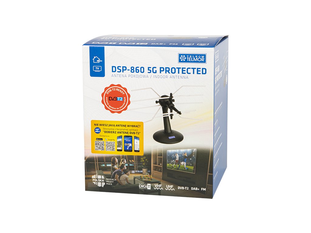 Antena DSP-860 5G Protected przeznaczona jest do odbioru TV sygnałów cyfrowych (DVB-T2) wewnątrz pomieszczeń w pobliżu odbiornika TV. Wbudowany filtr pasmowo-przepustowy skutecznie eliminuje zakłócające sygnały poza pasmowe (5G, LTE 700/800, GSM 1800 itp.)