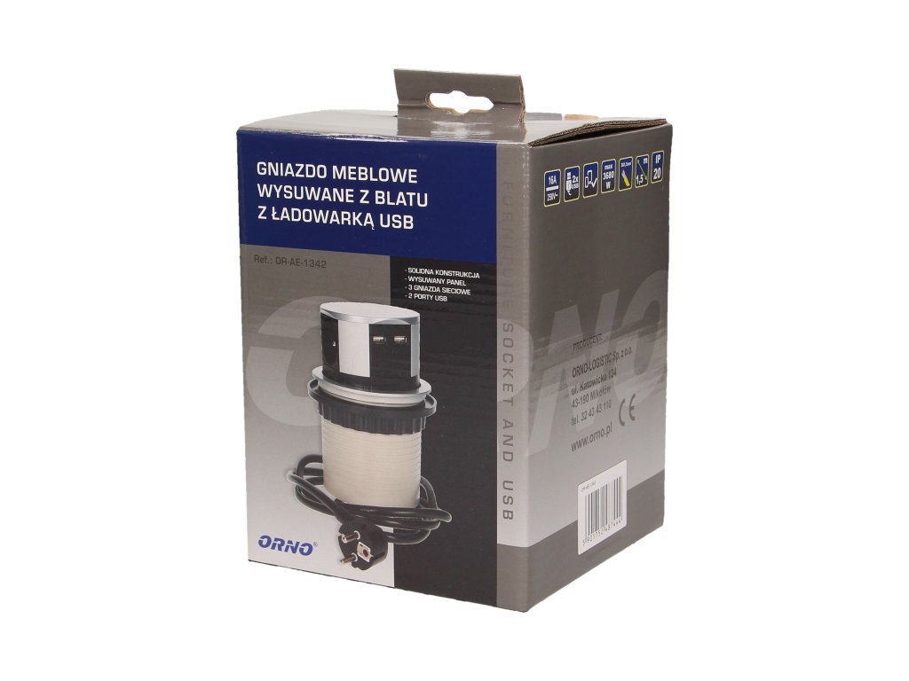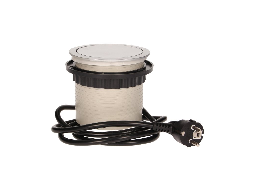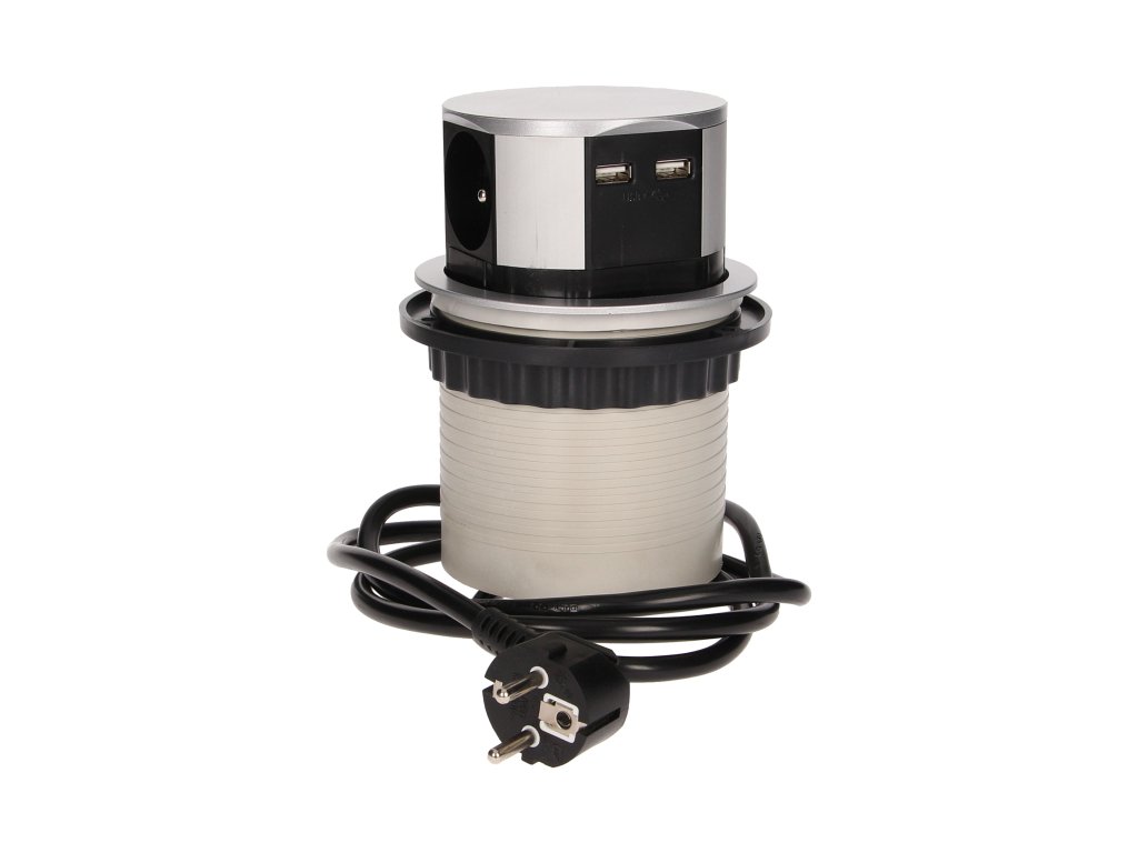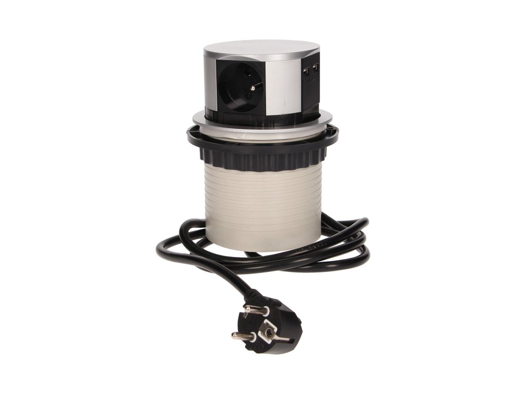 Set od tri utičnice 2P+Z s ugrađenim USB punjačem u uvlačnom gornjem poklopcu omogućuje pristup električnim utičnicama. Pritiskom na kućište, precizan mehanizam automatski pomiče ploču s utičnicama. Dizajnirano za unutarnju ugradnju u stolove, radne površine i uredski namještaj. Za instalaciju uređaja u stolnu ploču potreban je samo jedan otvor promjera 9,5 cm i dubine 10 cm.
