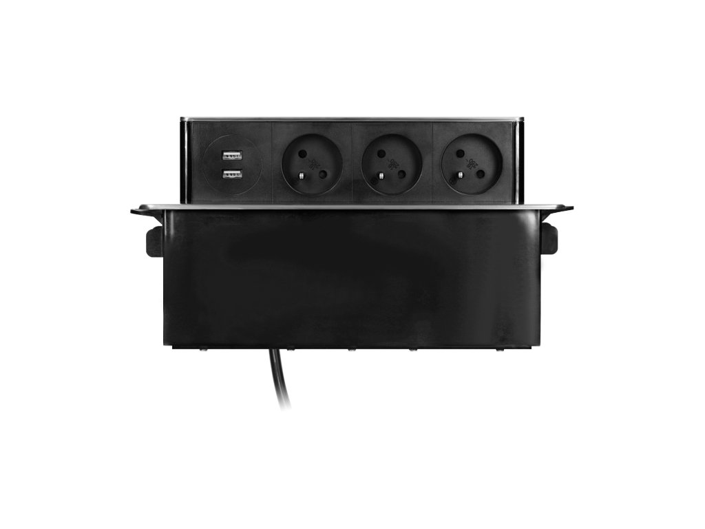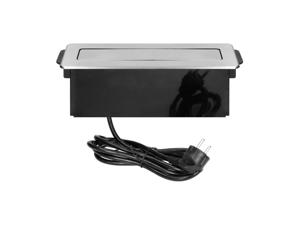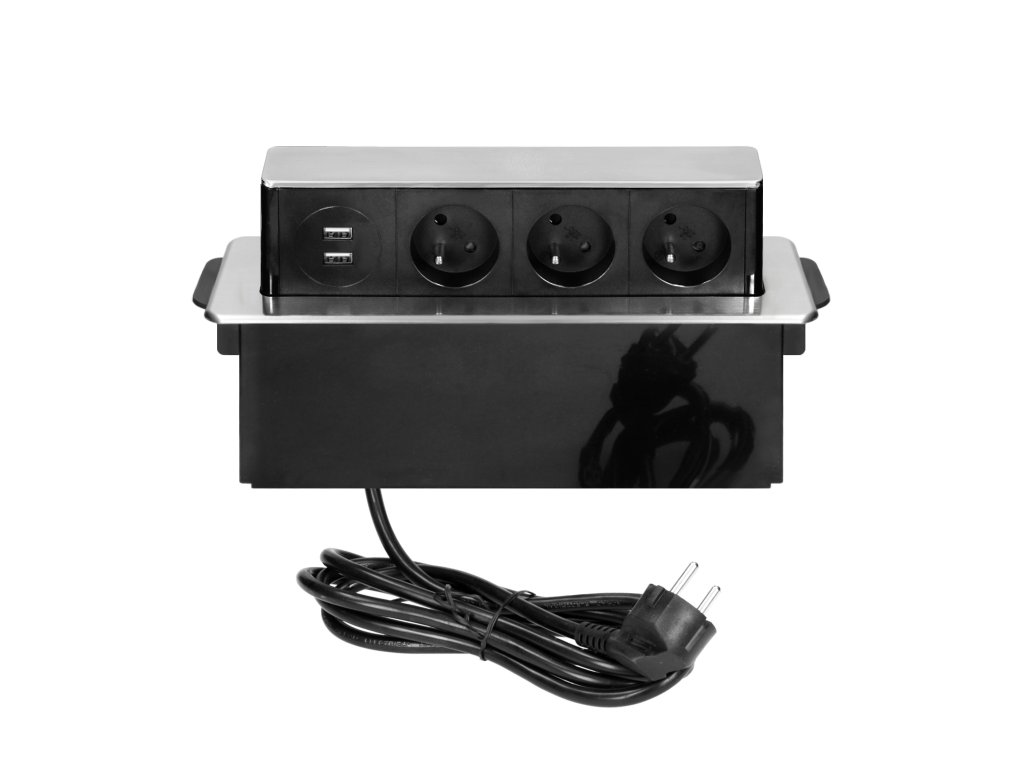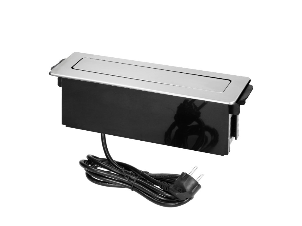 Ova elegantna kutija za napajanje INOX sadrži tri uzemljene utičnice tipa E i dvije USB utičnice. Može se ugraditi u konferencijske stolove, uredske stolove ili kuhinjske stolove. Kutija je integrirana u površinu stola i njen ravni, frezani rub gotovo je nevidljiv. Ova kutija za napajanje izvuče se samo kada trebate priključiti neki pomoćni uređaj. Kabel je dug 2 m.