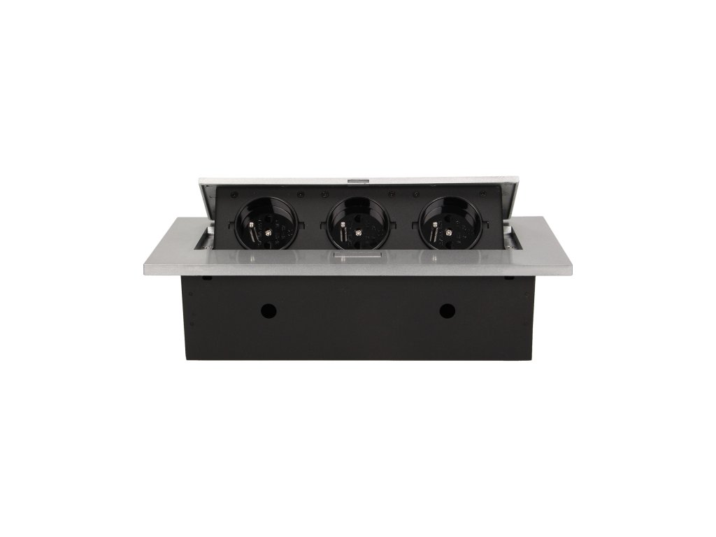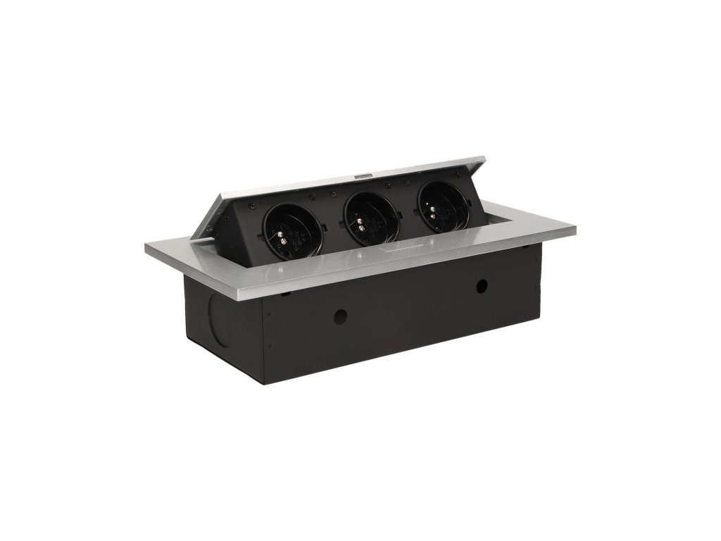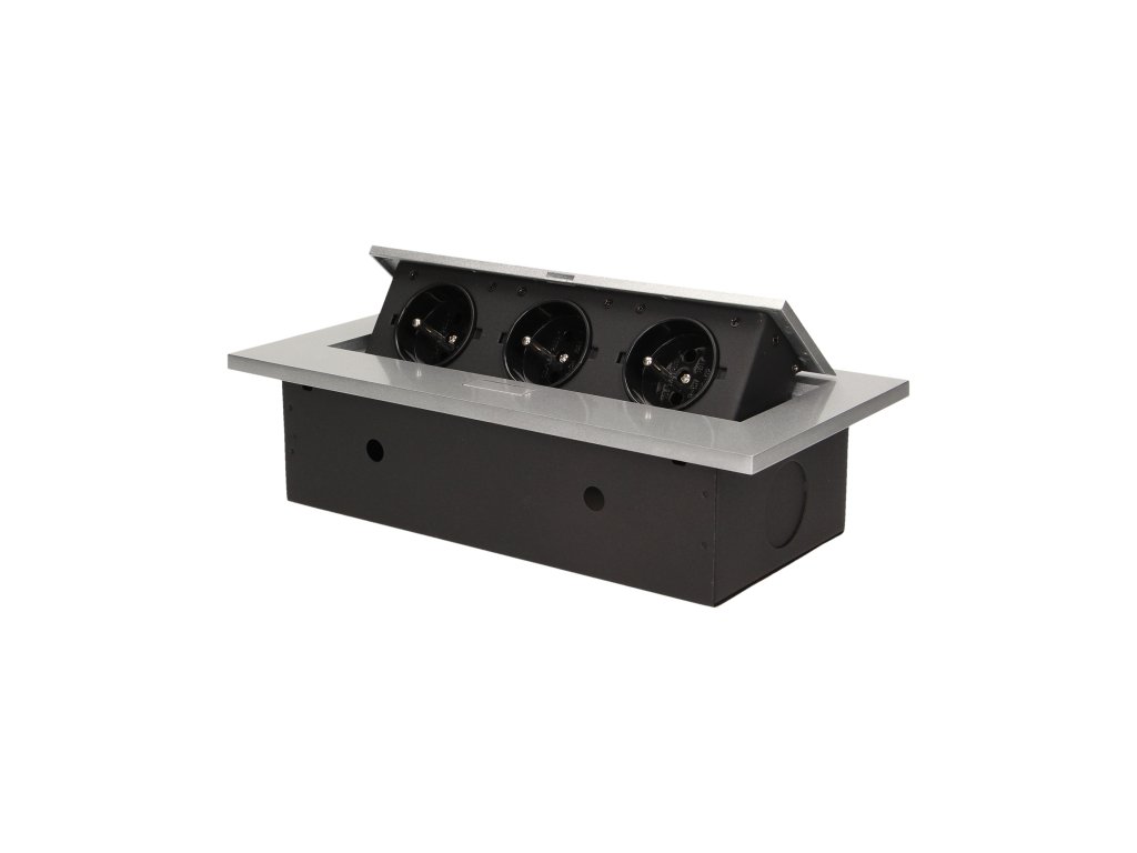 Set od tri električne utičnice 2P+Z u uvlačivom gornjem poklopcu. Namijenjeno za unutarnju montažu u stolove, stolne plohe i stoliće u vertikalnom i horizontalnom položaju, pritom omogućavajući pristup električnim utičnicama.Opće informacije: