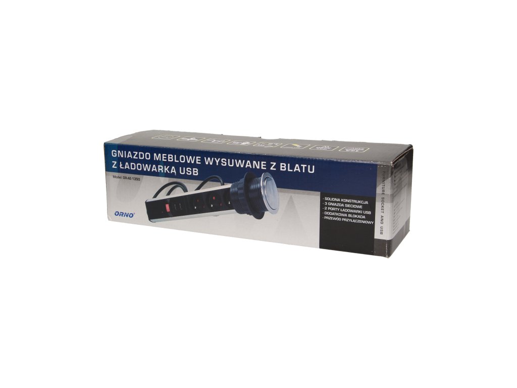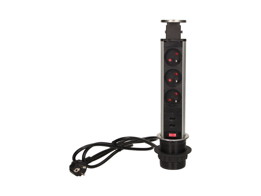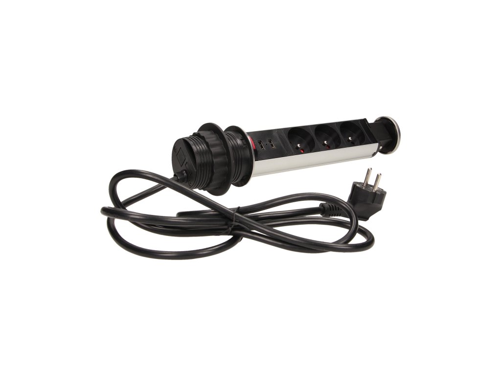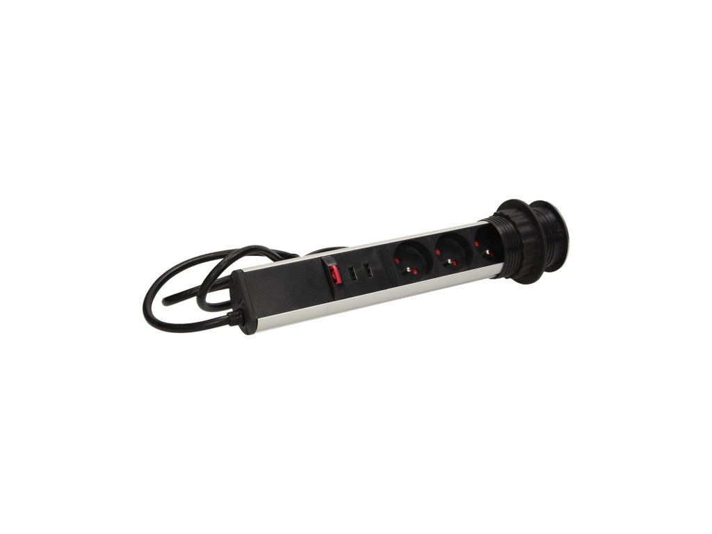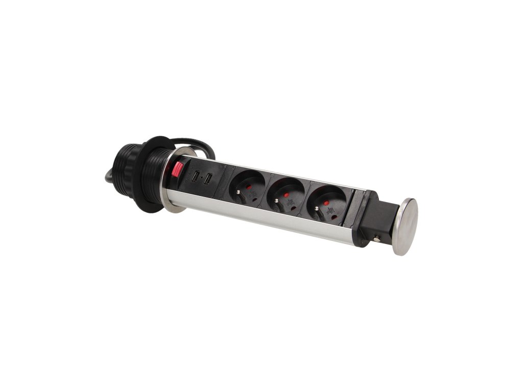 Set od tri utičnice 2P+Z s ugrađenim USB punjačem u izvlačnom gornjem poklopcu omogućava pristup električnim utičnicama. Ima izvlačni panel s utičnicama i dodatnu bravu. Dizajnirano za unutarnju ugradnju u stolove, radne ploče i uredski namještaj. Za ugradnju uređaja u radnu ploču potreban je samo jedan otvor promjera 6 cm.